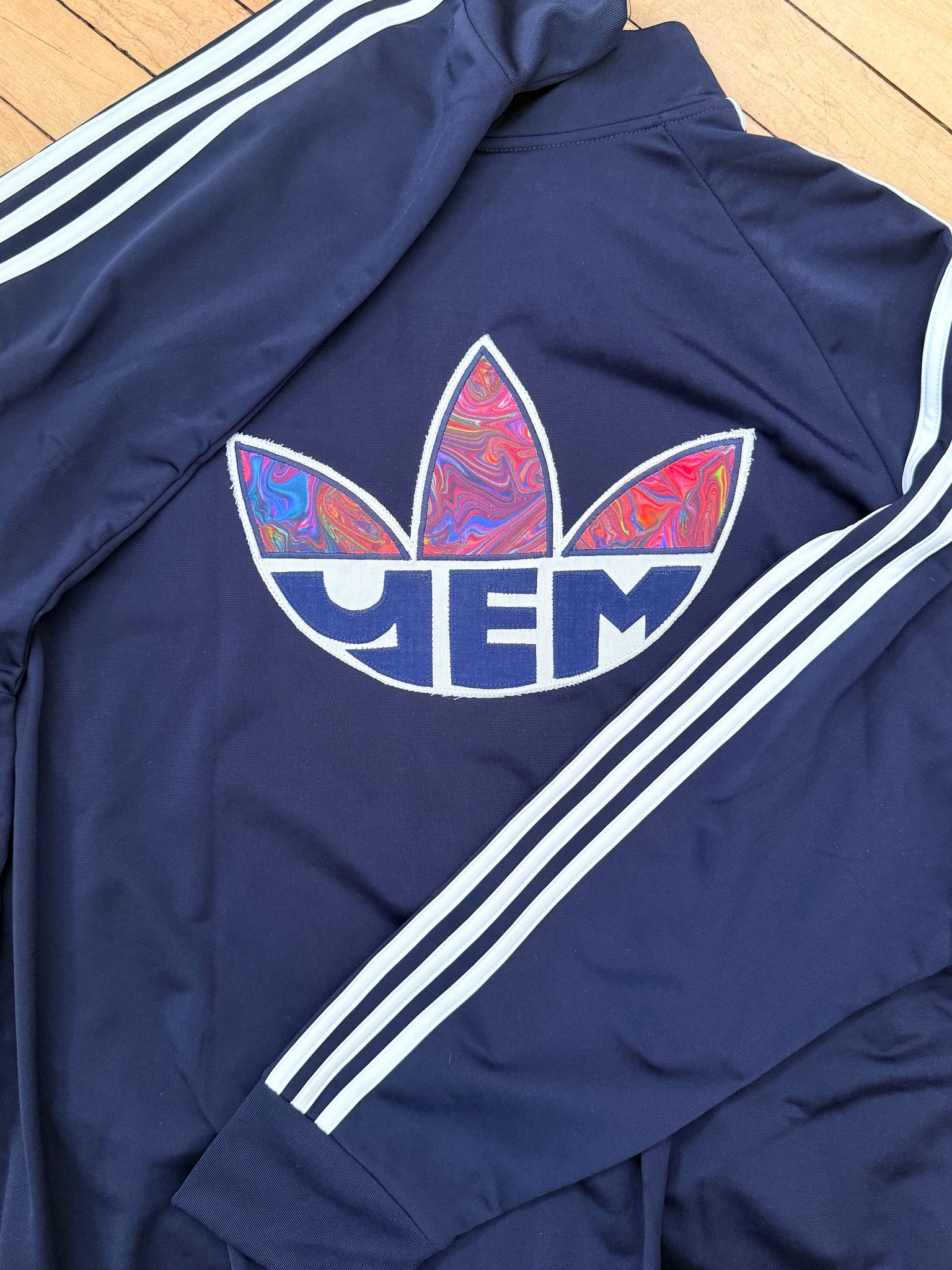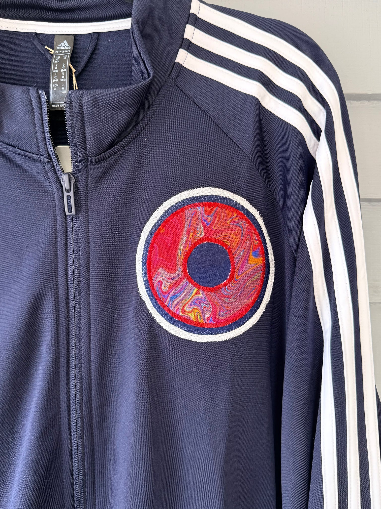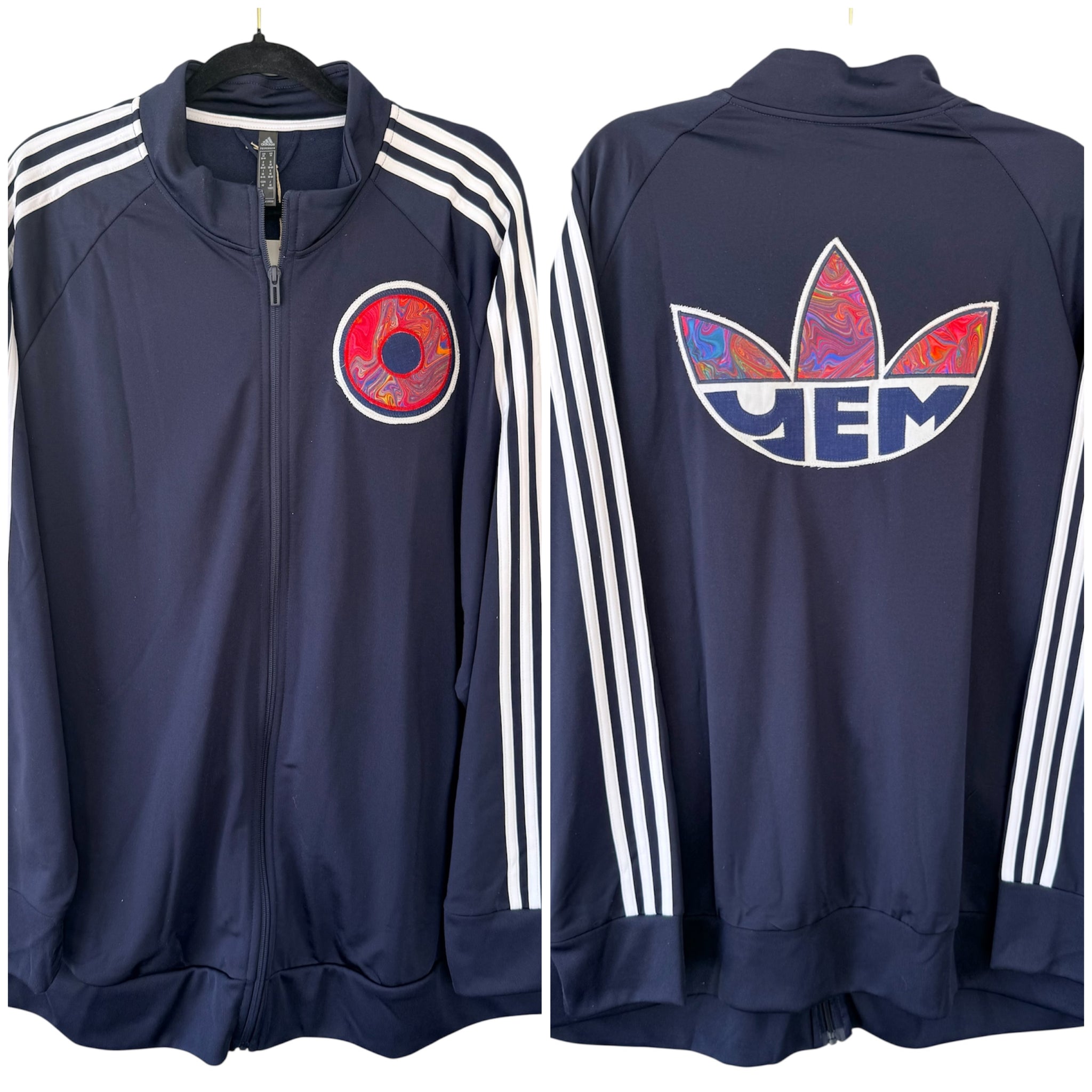 Men’s 4x New with tags Adidas jacket with added sewn appliqué patches. One of a kind color combinations & design.