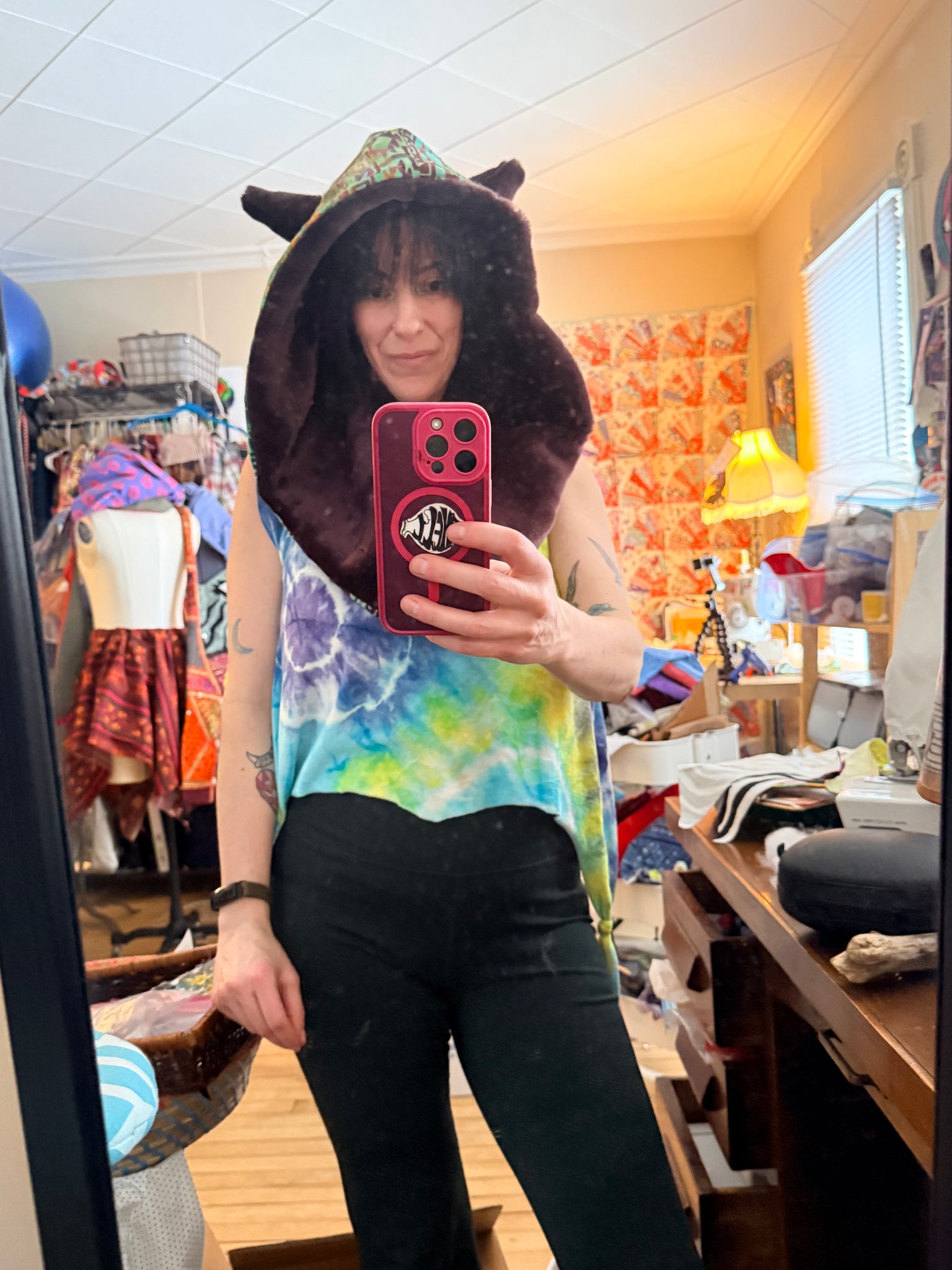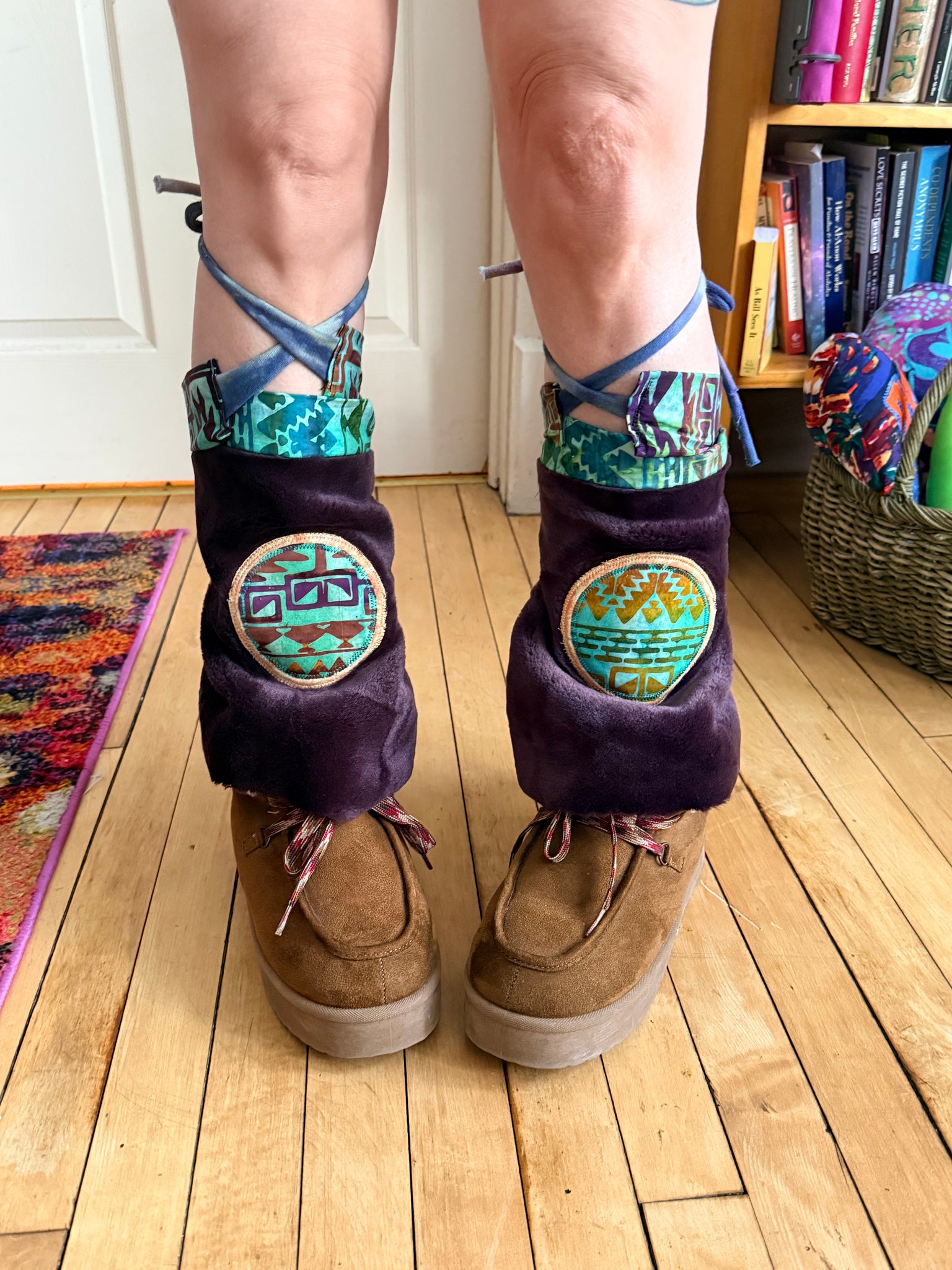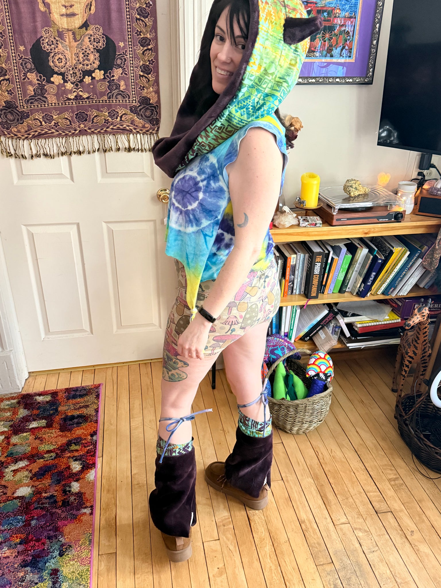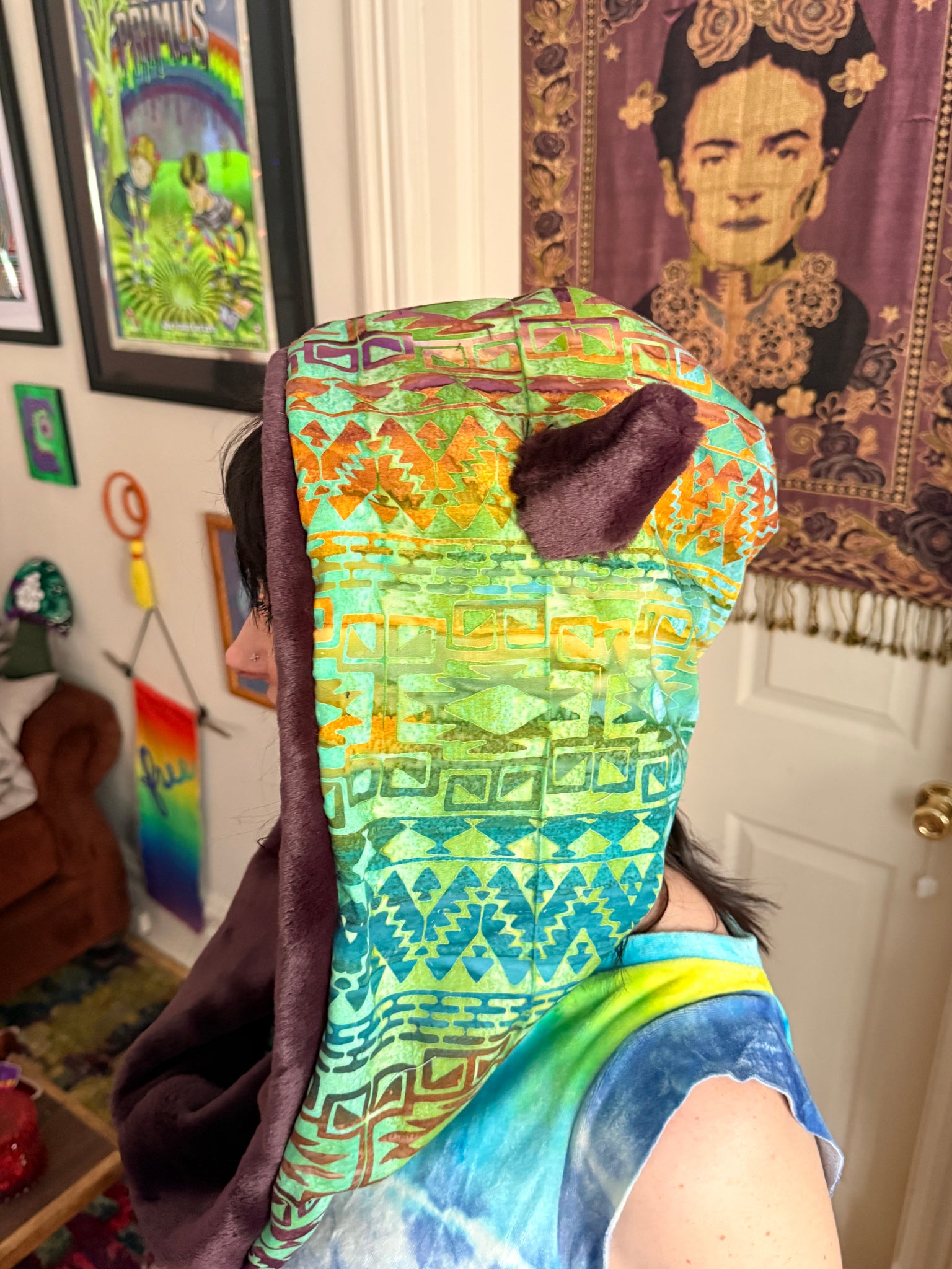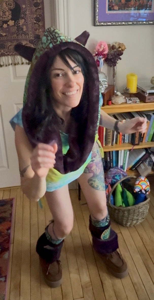 Fuzzy infinity hood/cowl with Aztec art inspired batik cotton fabric outter shell and faux fur lining with Coyote Ears. Fashioned and designed around Huēhuehcoyōtl (weh weh Kojo£t) Aztec mythology God of music, dance mischief and song “old old coyote” super cute hood with Kojo£ (coyote) ears & adjustable leg flairs to fit any size that ties up with stretchy hemp knit. Made with recycled materials and it’s one of a kind!
