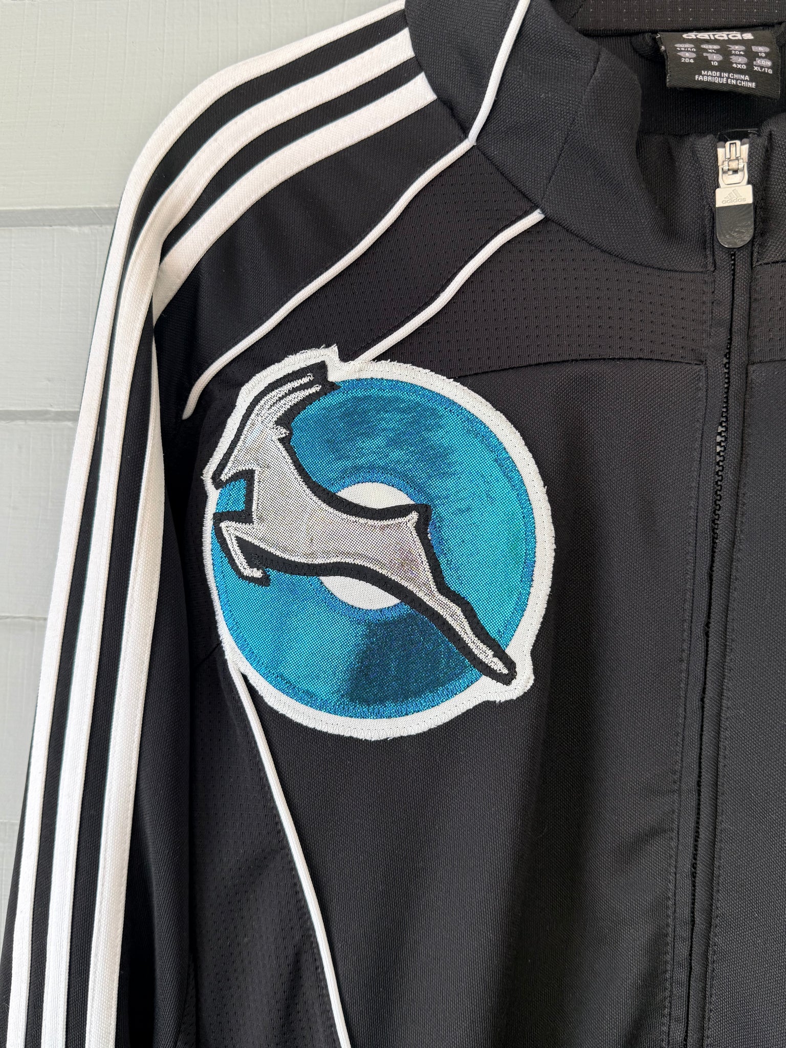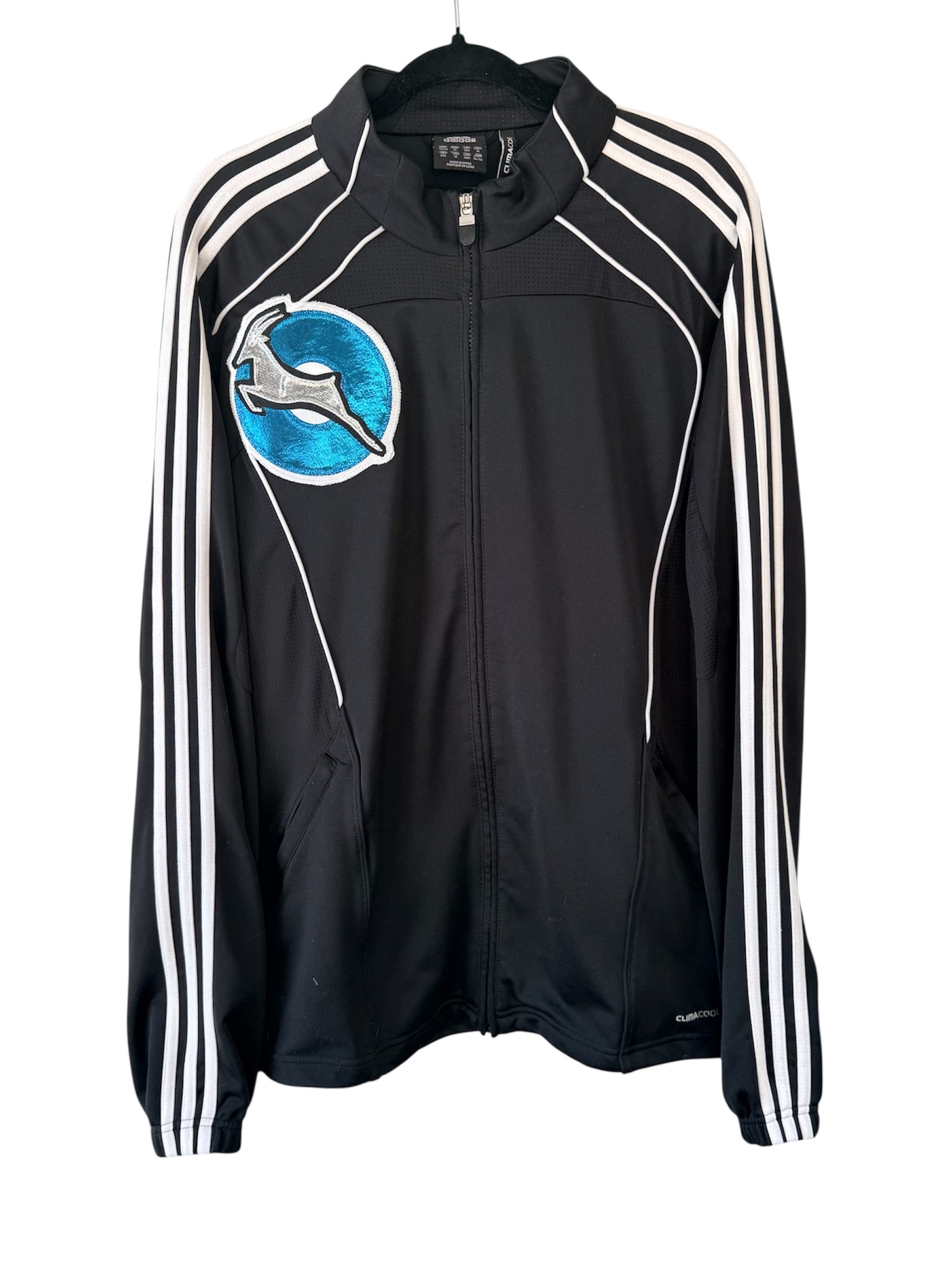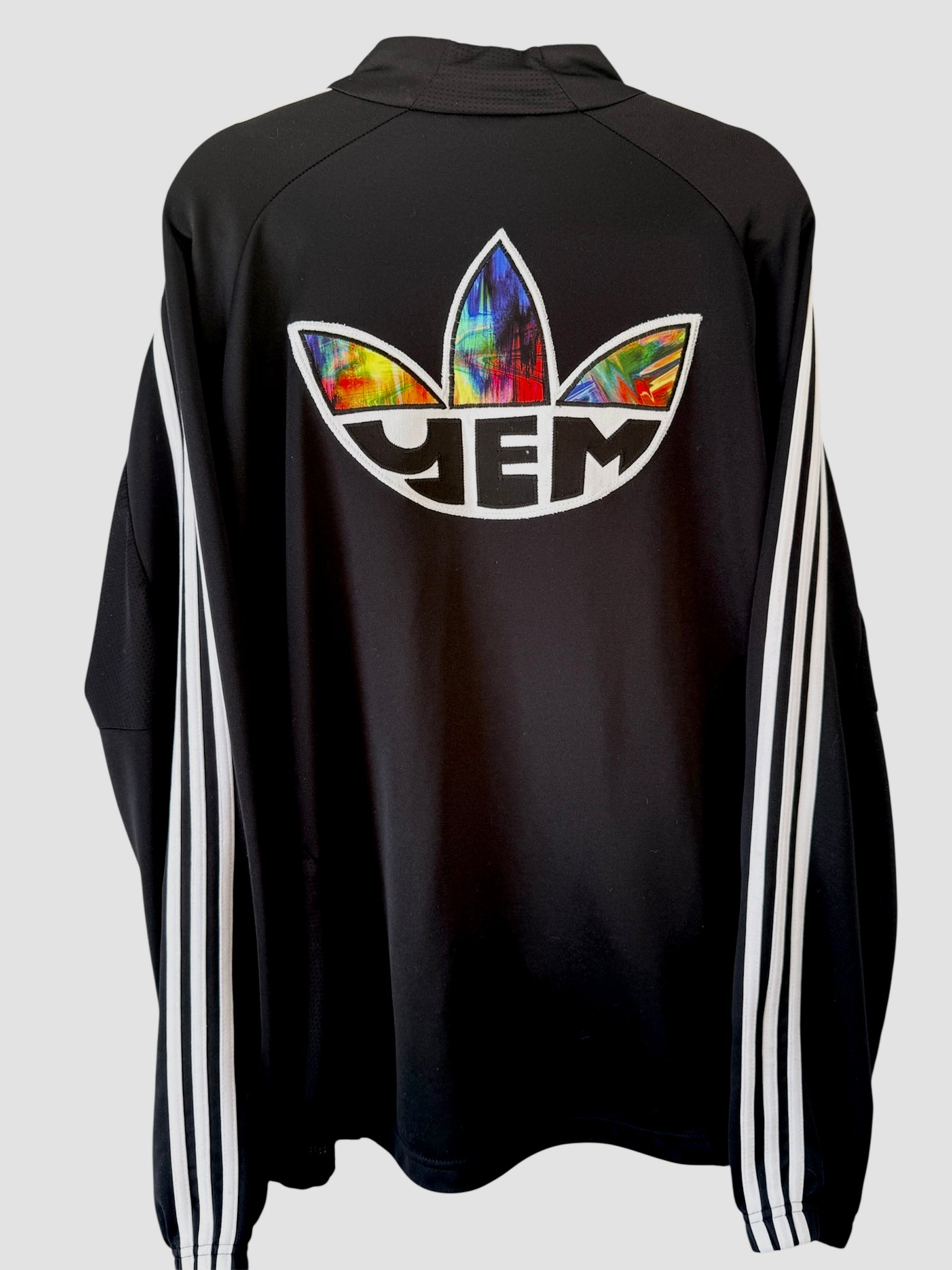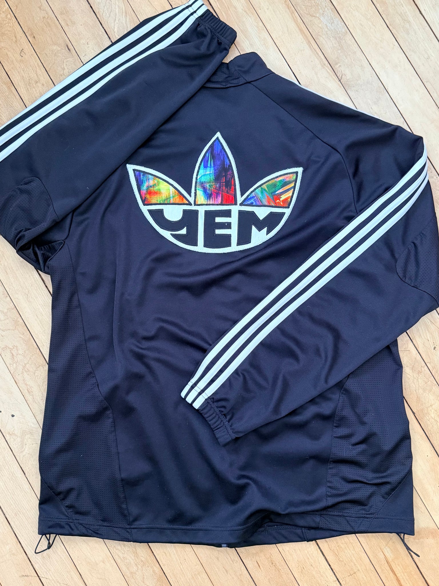 Mens clima Adidas’s Track jacket made for a warmer climate, zippered pockets, Secondhand sourced with added sewn appliqué patches. One of a kind color combinations & design.