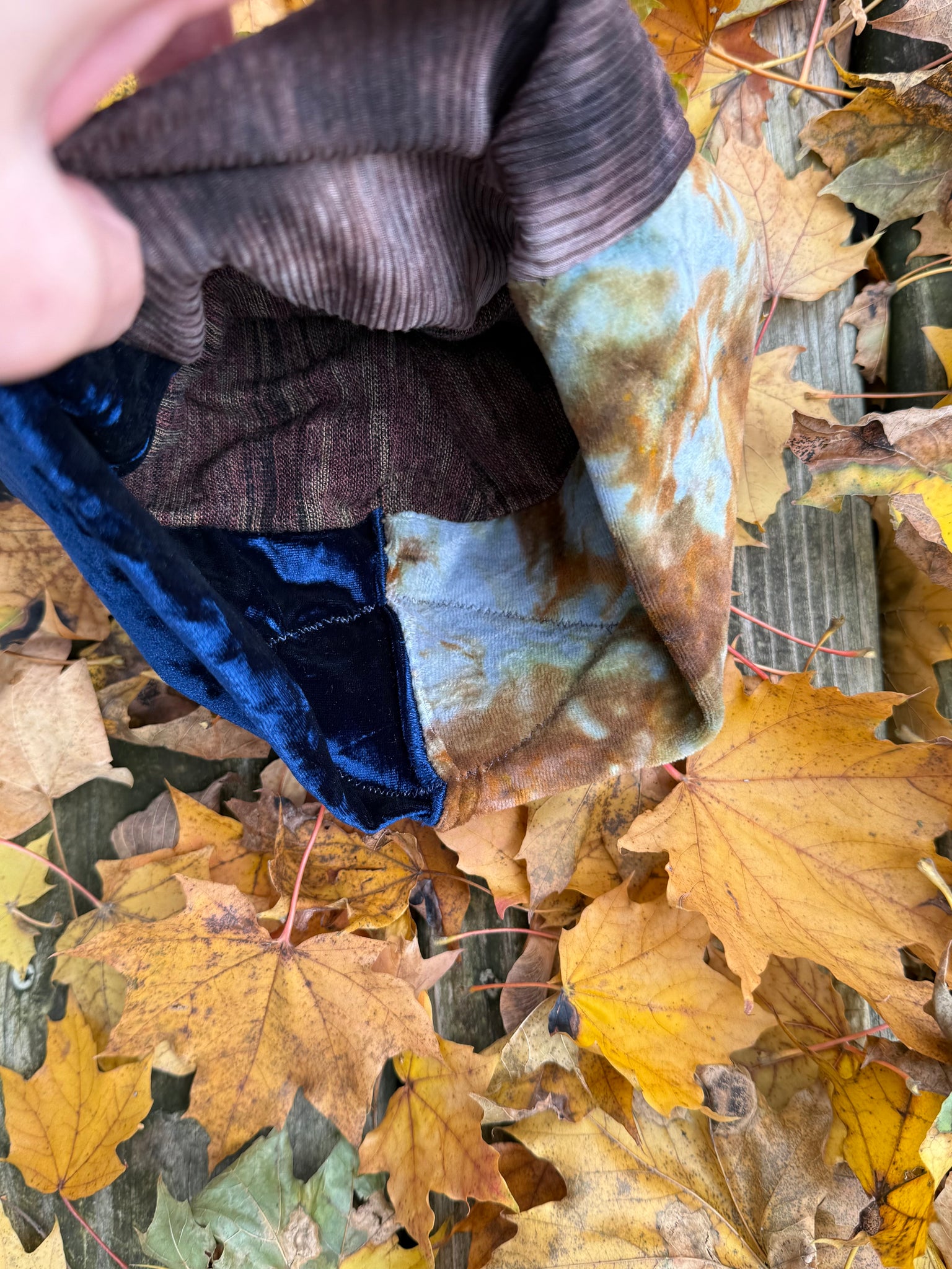 Medium - Made with organic bamboo Velour and ice dyed by me, velour & ice dyed jersey knit. Hand made twisted beanie is one of a kind. Patchwork & Added appliqué to this one!