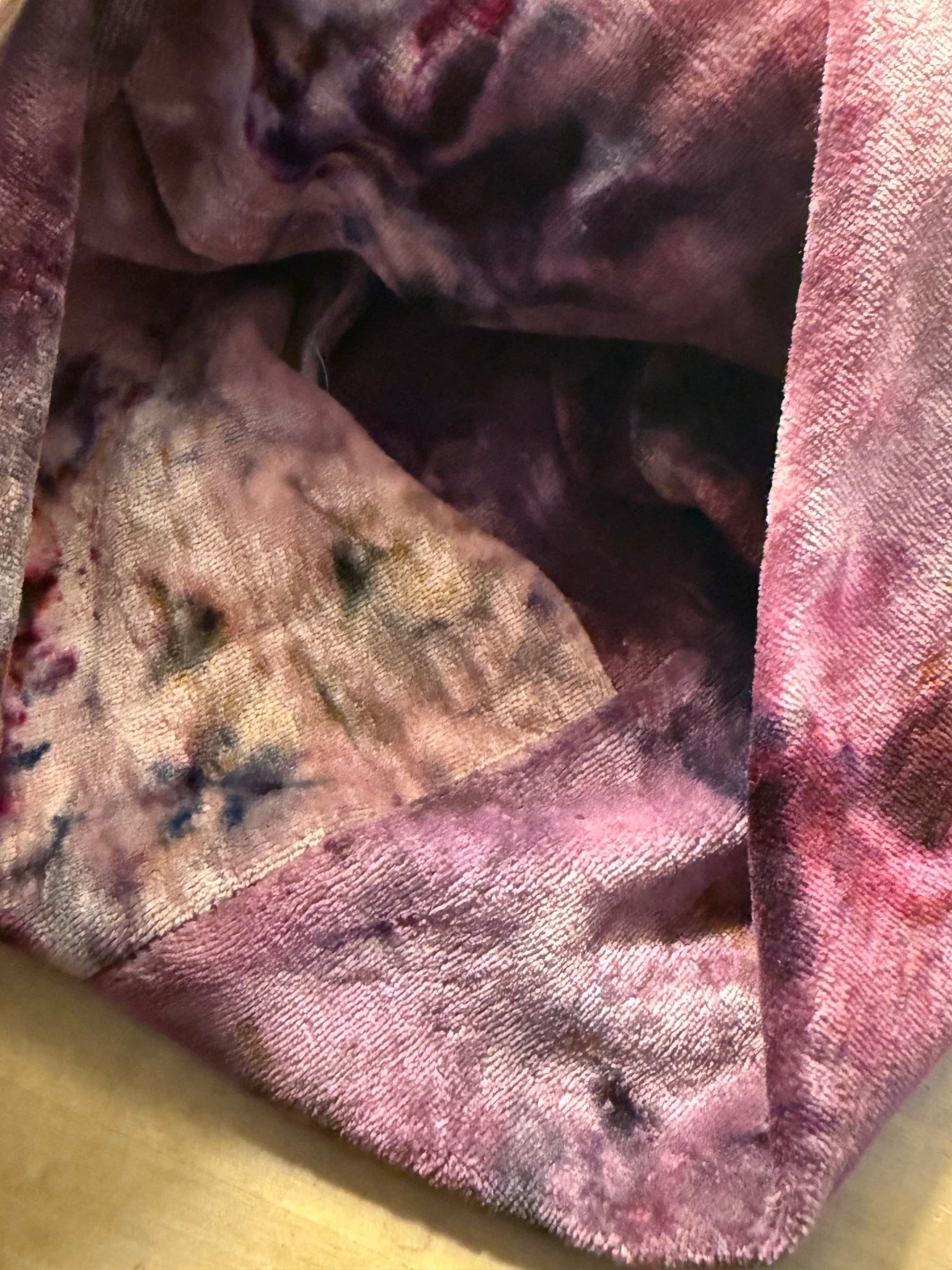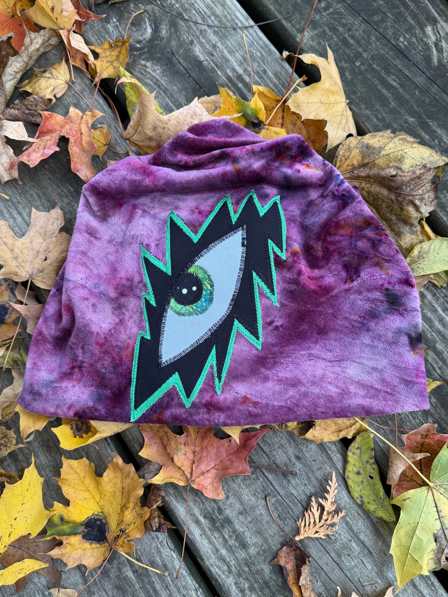 Made with organic bamboo Velour and ice dyed by me. Hand made twisted beanie is one of a kind. Added my design 13 point bolt eye of the universe appliqué to this one!