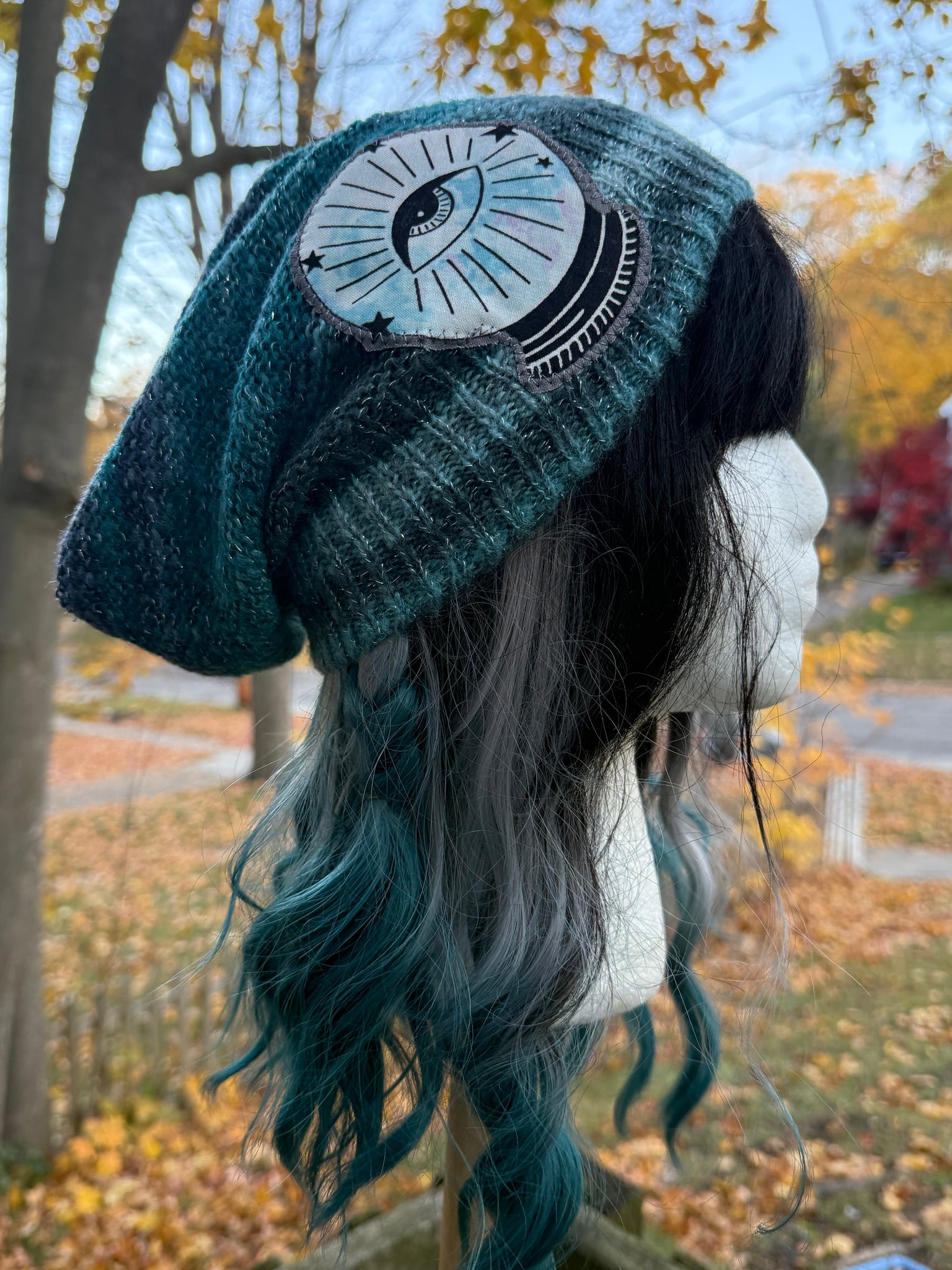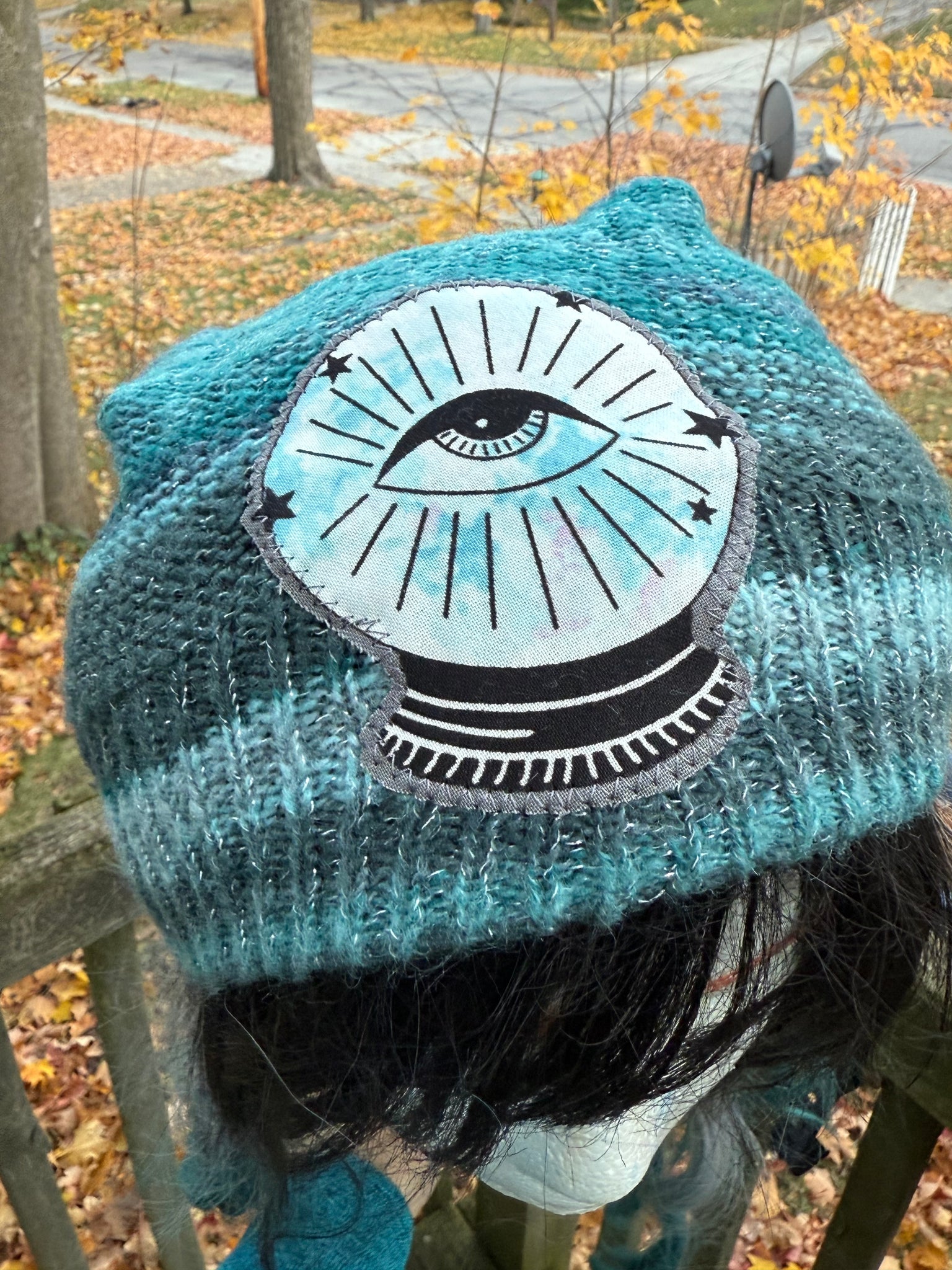 Handmade and constructed from a sweater with sparkly thread and added appliqué patches sew onto the hat. 20-21” with stretch Leg warmers are also stretchy and super cute pairing with the hat and have appliqué crystals on the top front. One of a kind