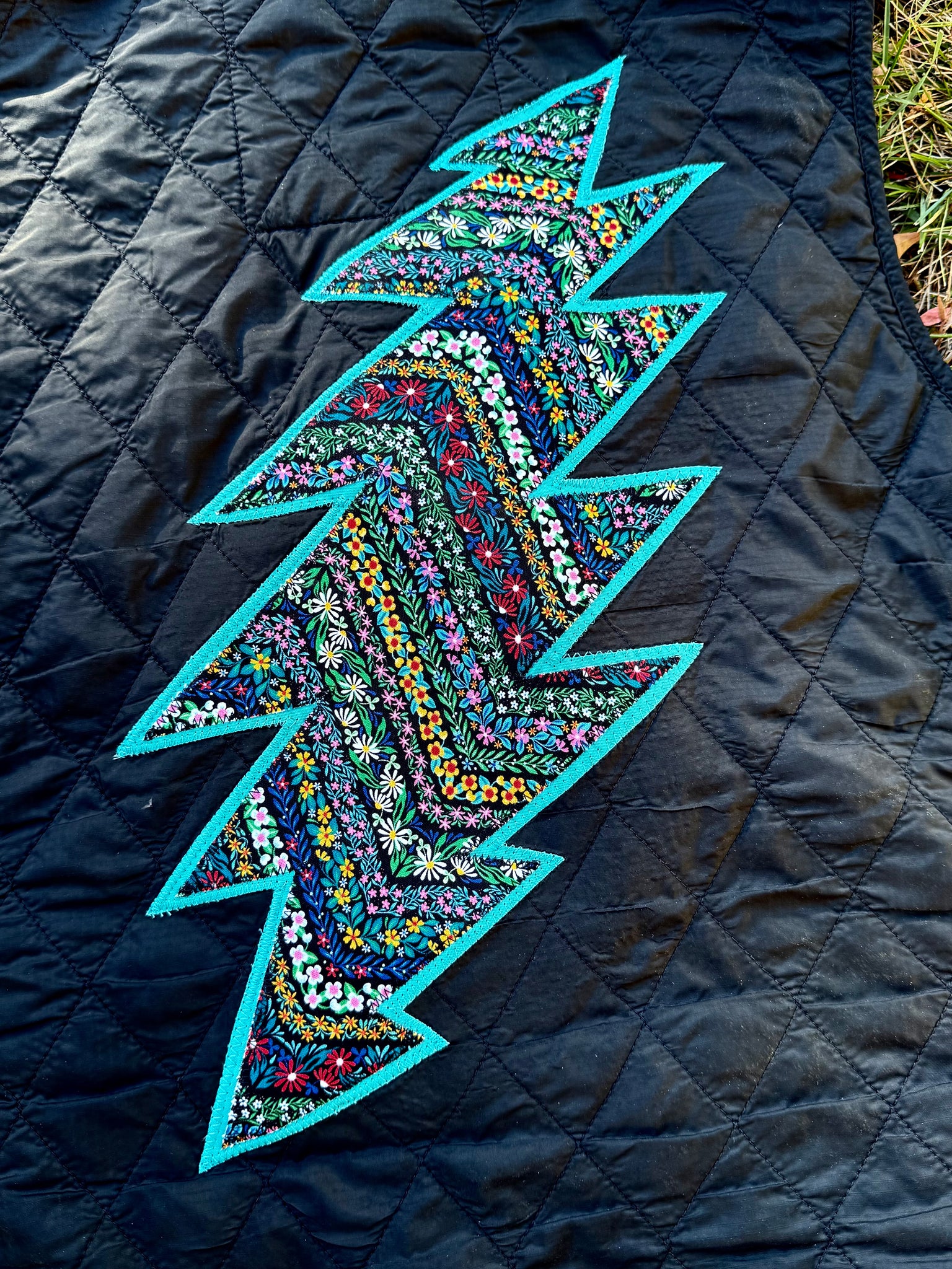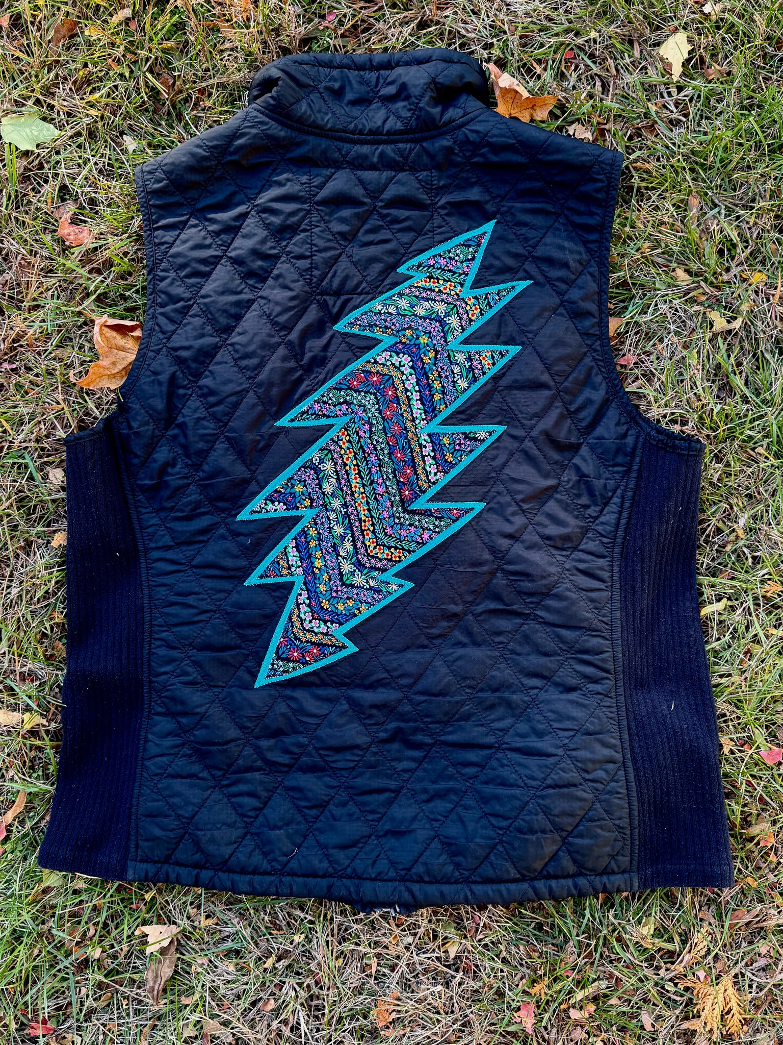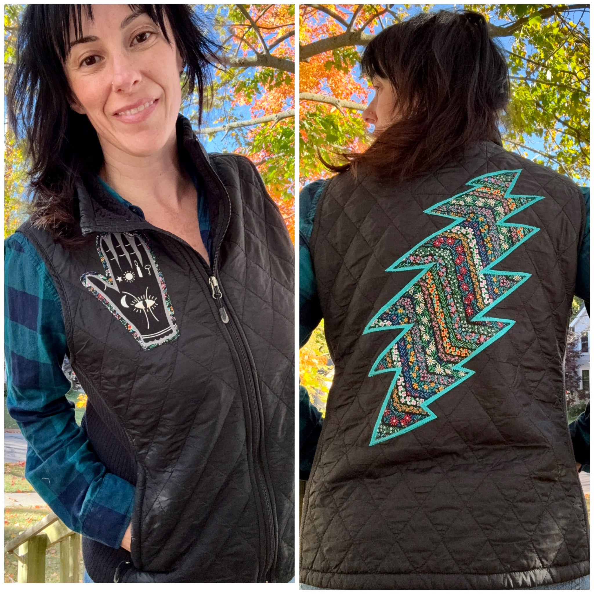 Secondhand sourced with added sewn appliqué patches. One of a kind color combinations & design.