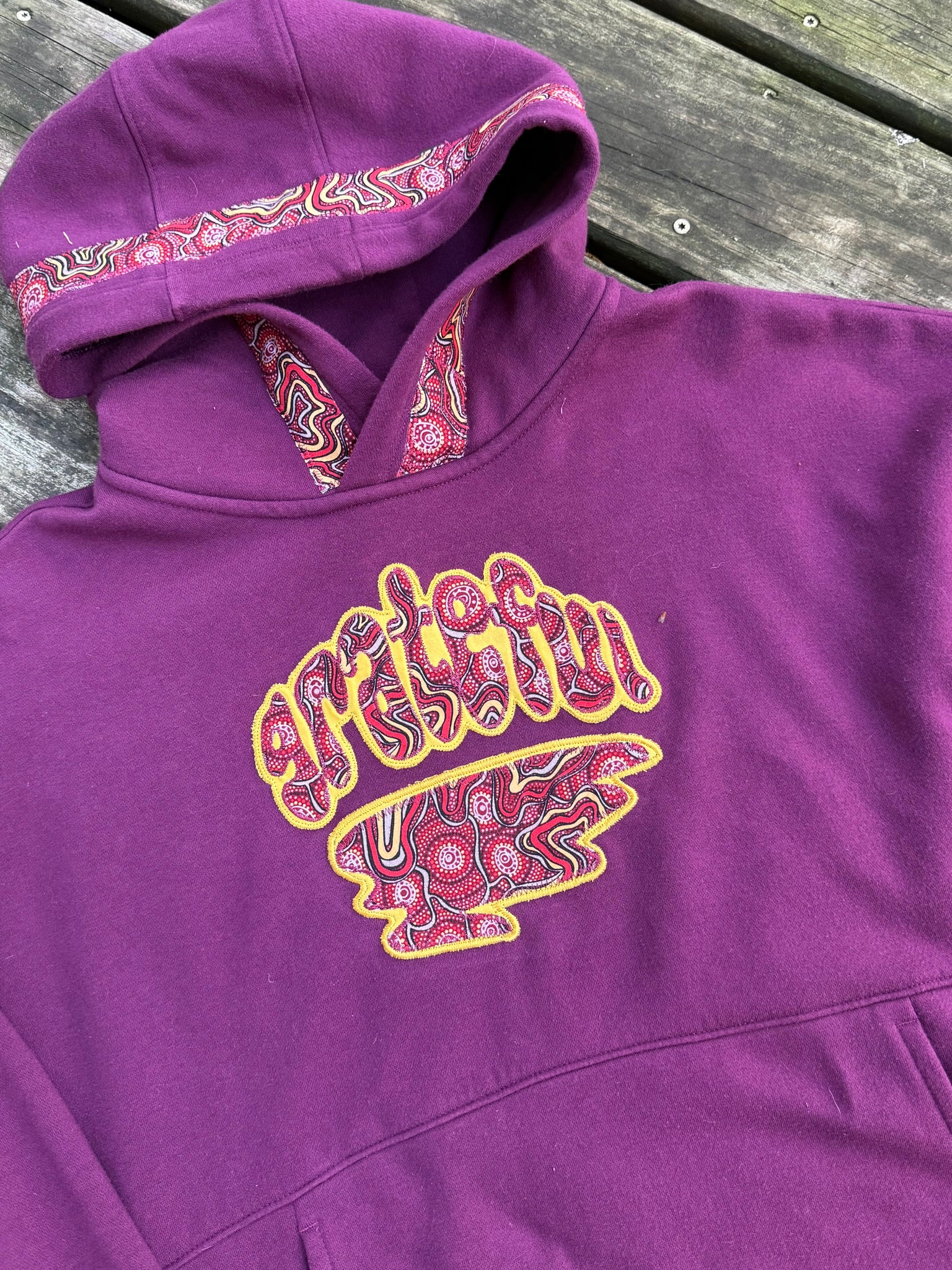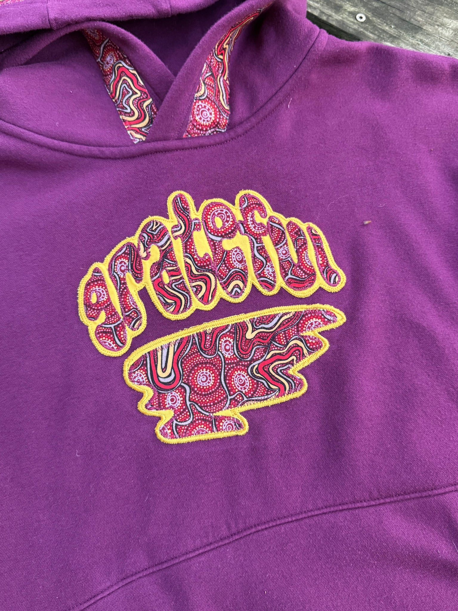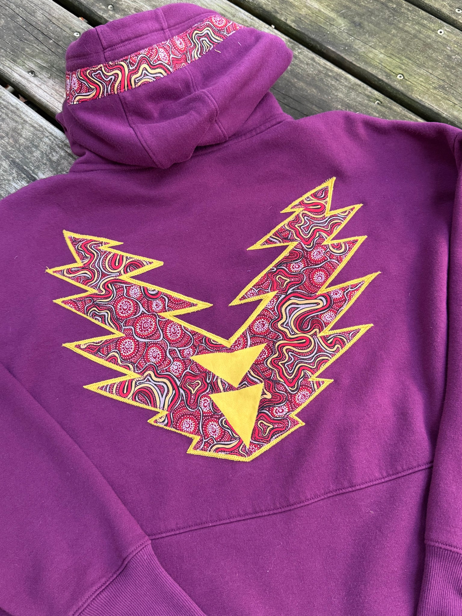 Secondhand sourced garment with added sewn appliqué patches. One of a kind color combinations & design.