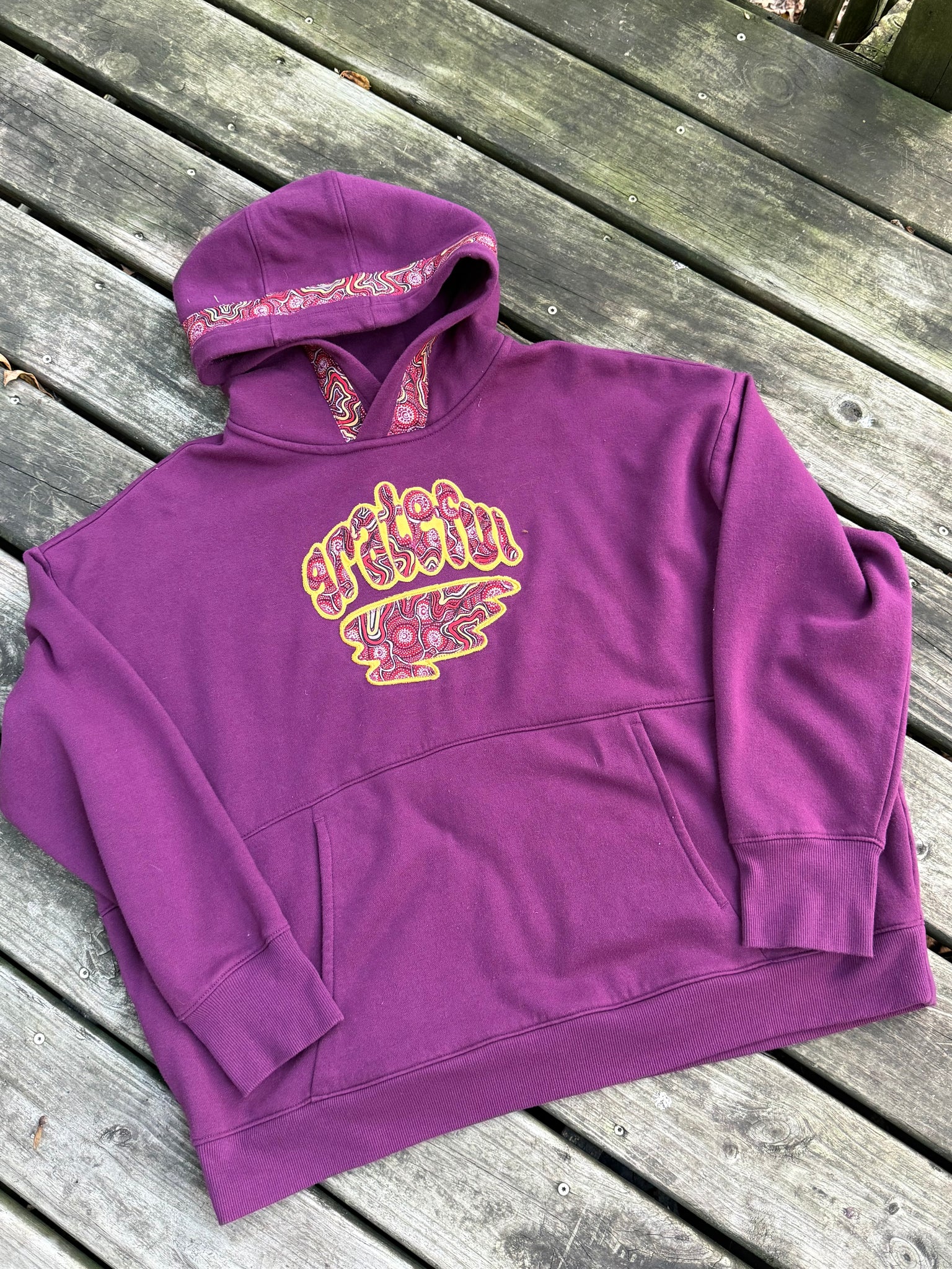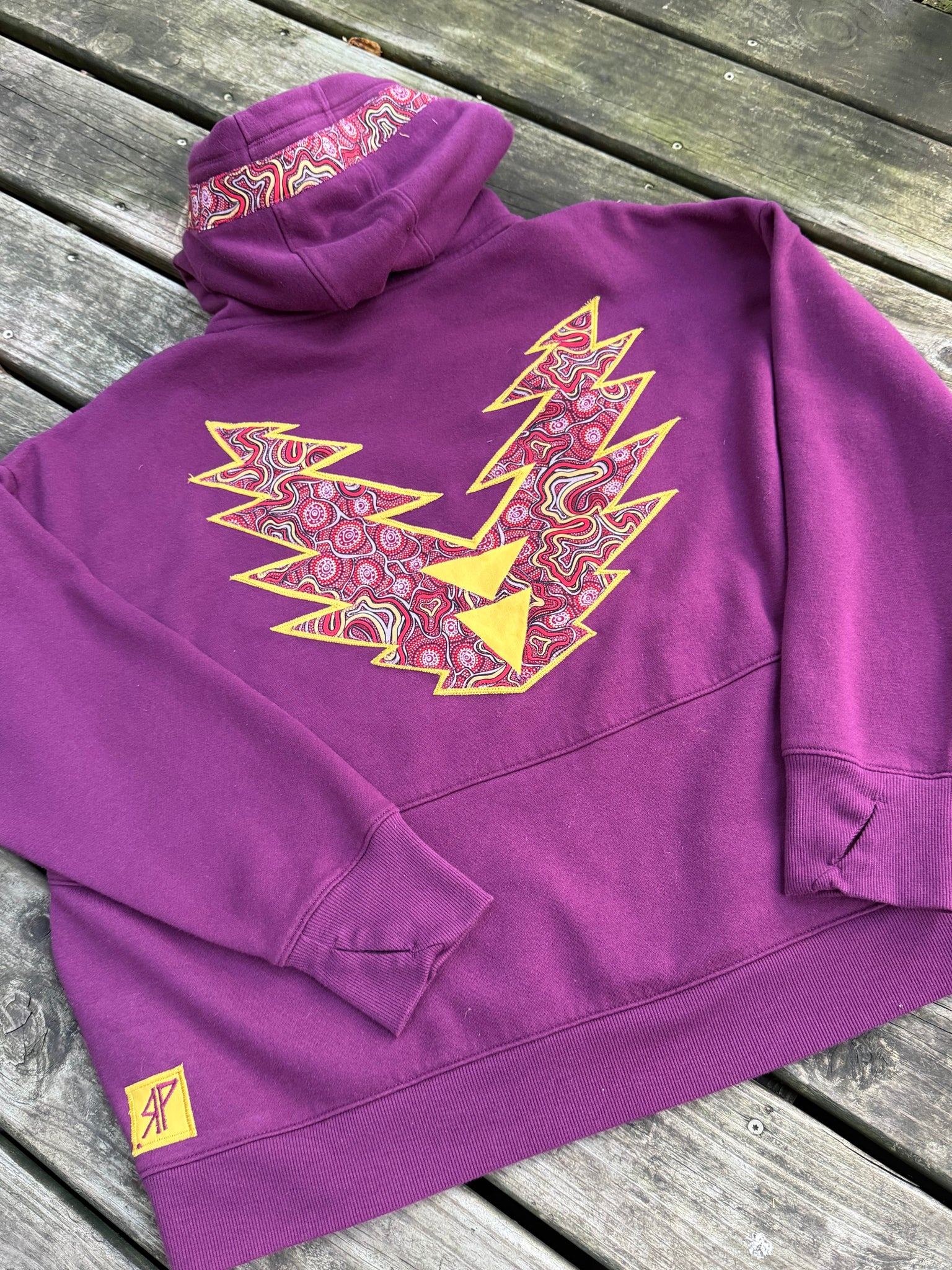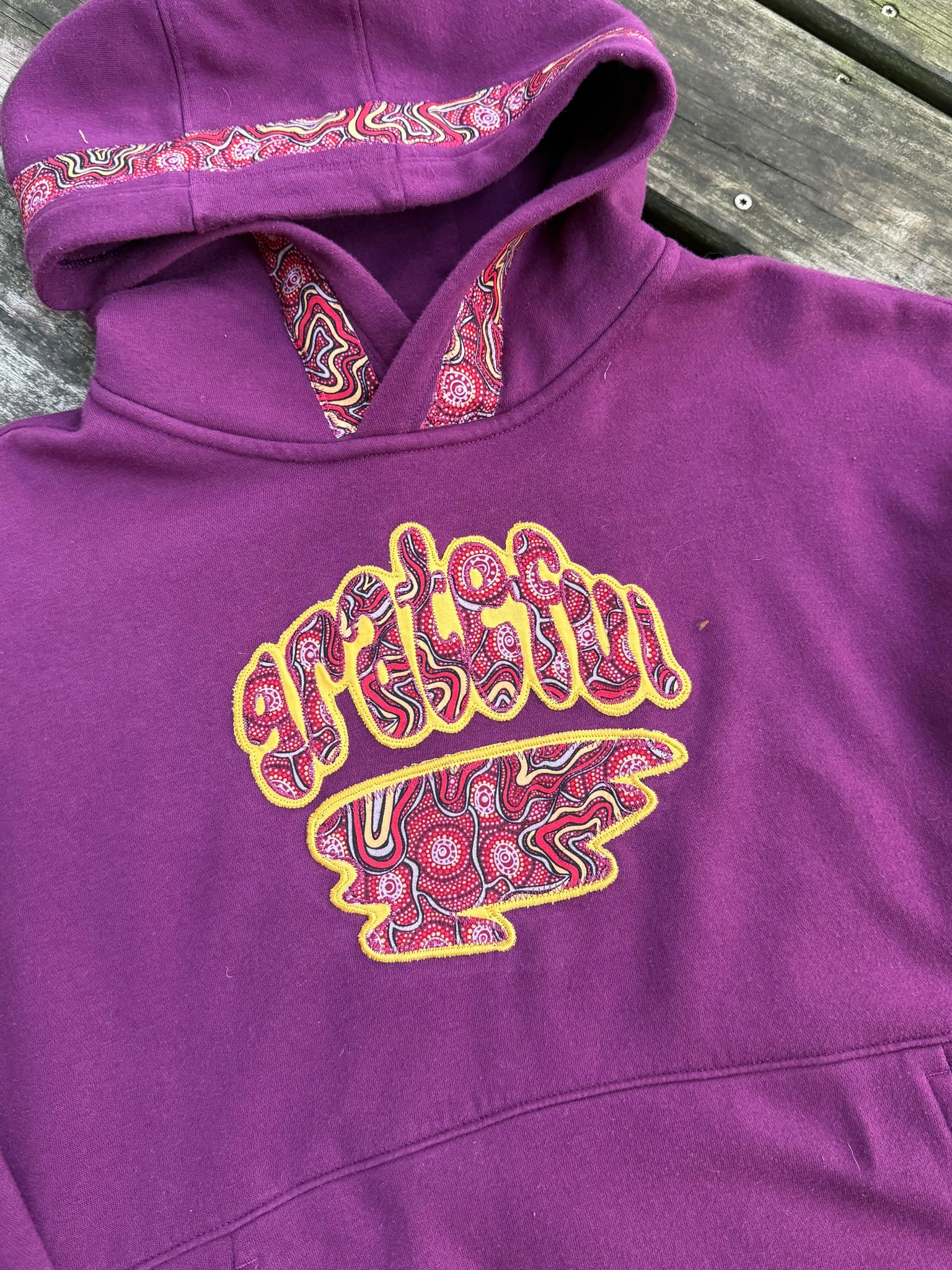 Secondhand sourced garment with added sewn appliqué patches. One of a kind color combinations & design.