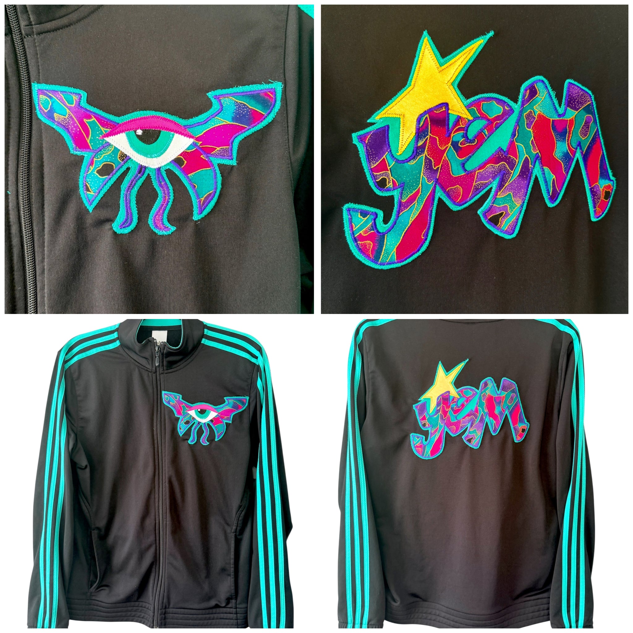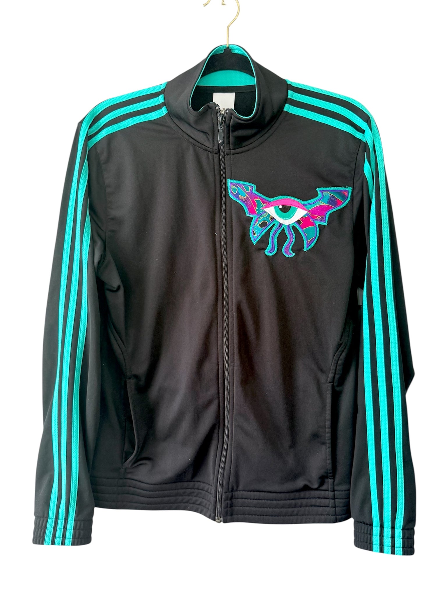 Secondhand Adidas in mint condition ladies large added sewn appliqué patches. One of a kind color combinations & design. Vintage & recycled cotton fabric used for this one.