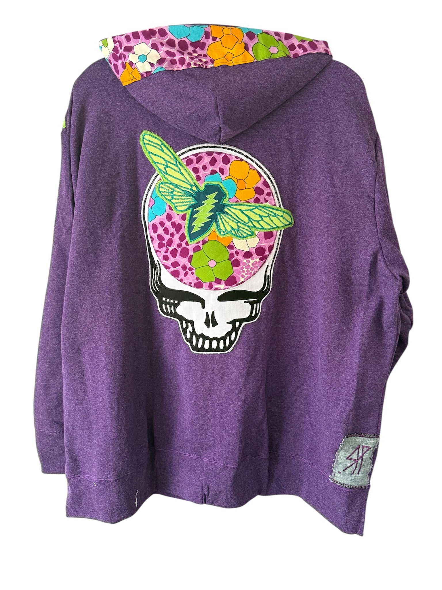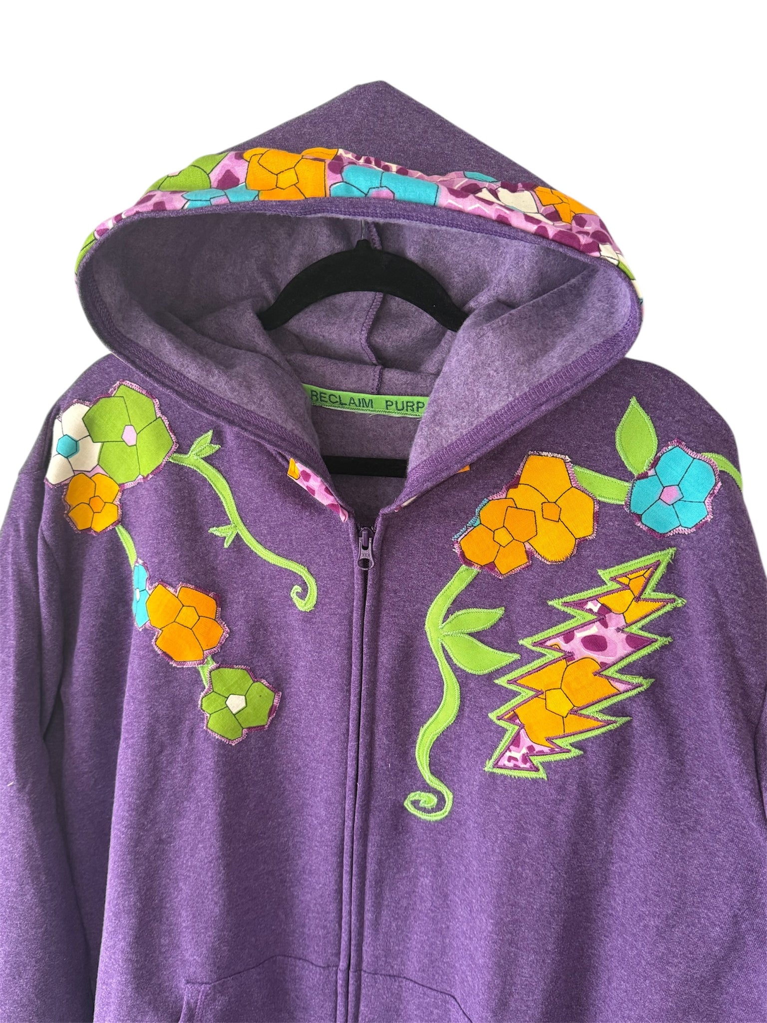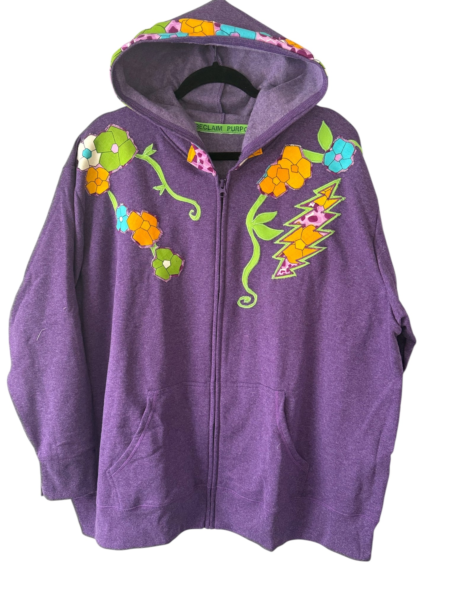 Size 3x zip up hoodie with hand drawn, cut and sewn appliqué and hood trim accent. One of a kind in color and design, made with vintage fabrics.