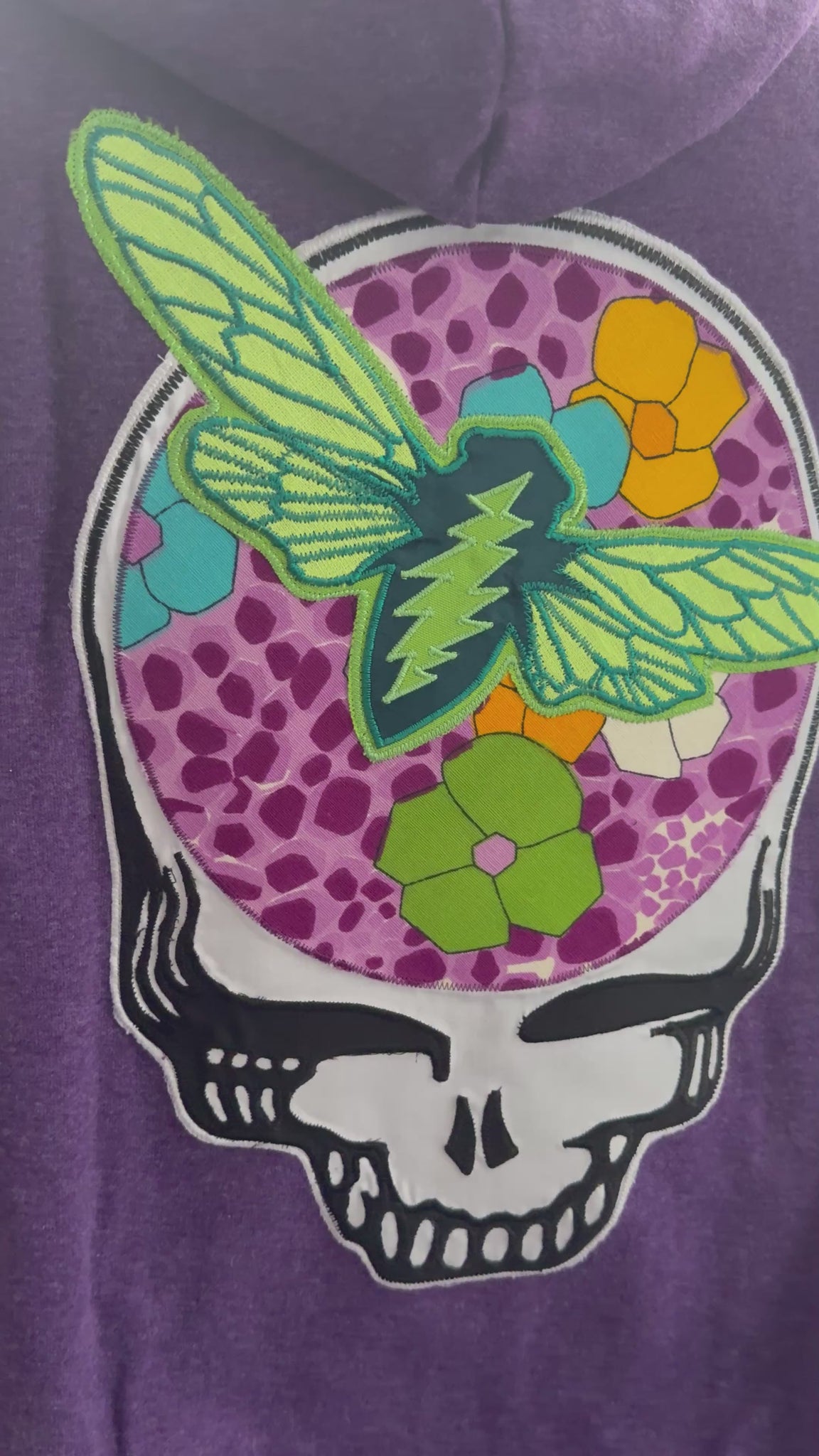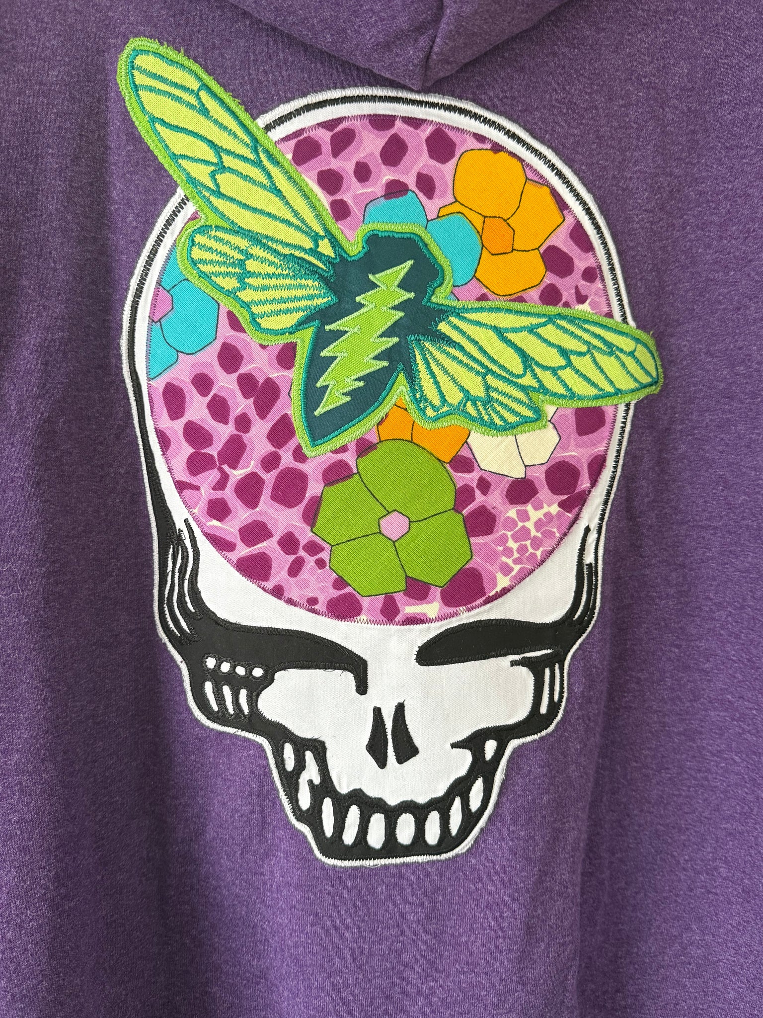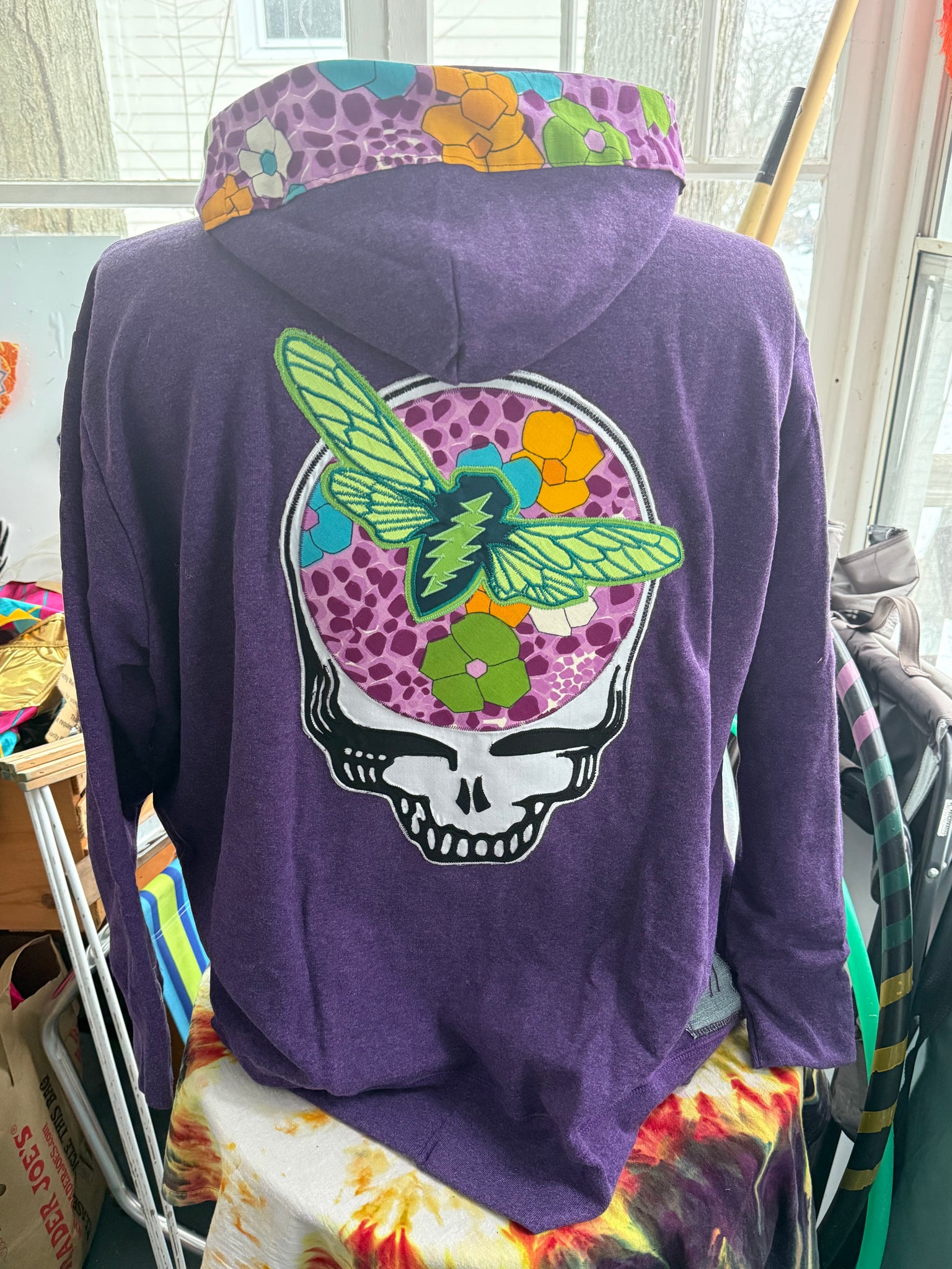 Size 3x zip up hoodie with hand drawn, cut and sewn appliqué and hood trim accent. One of a kind in color and design, made with vintage fabrics.
