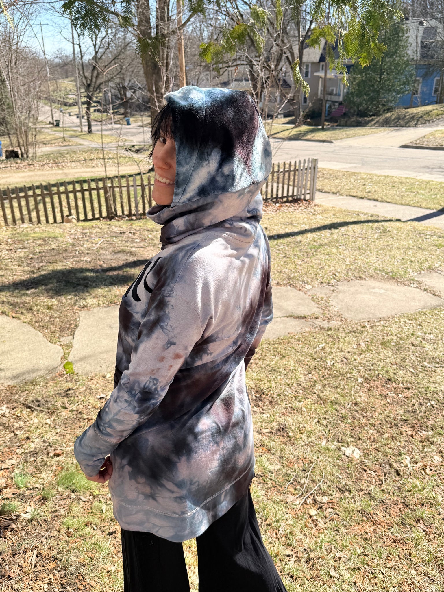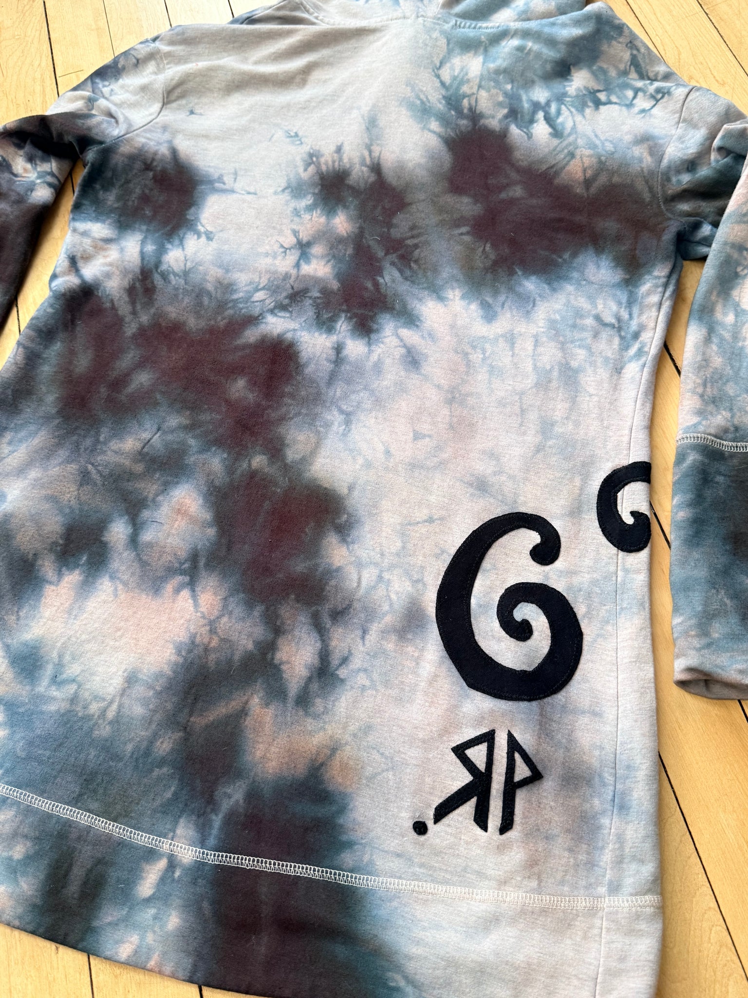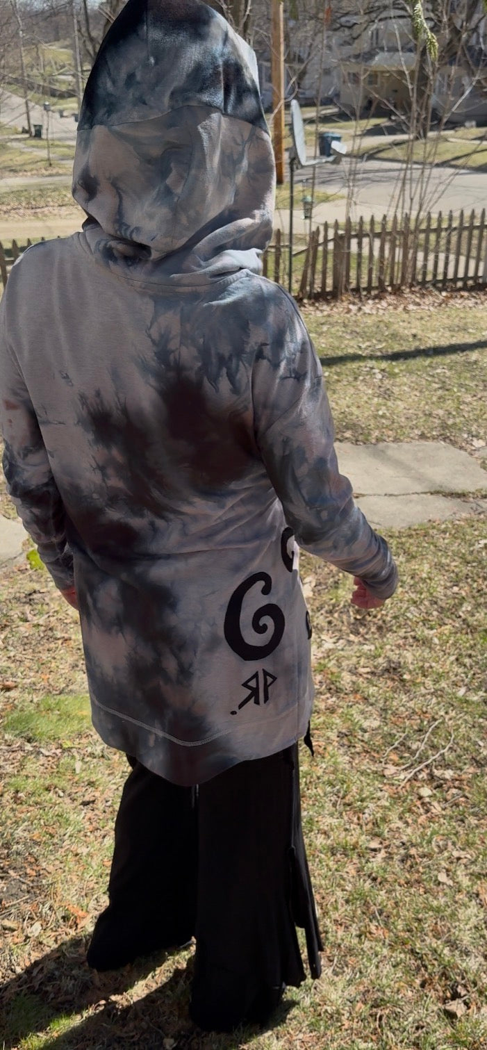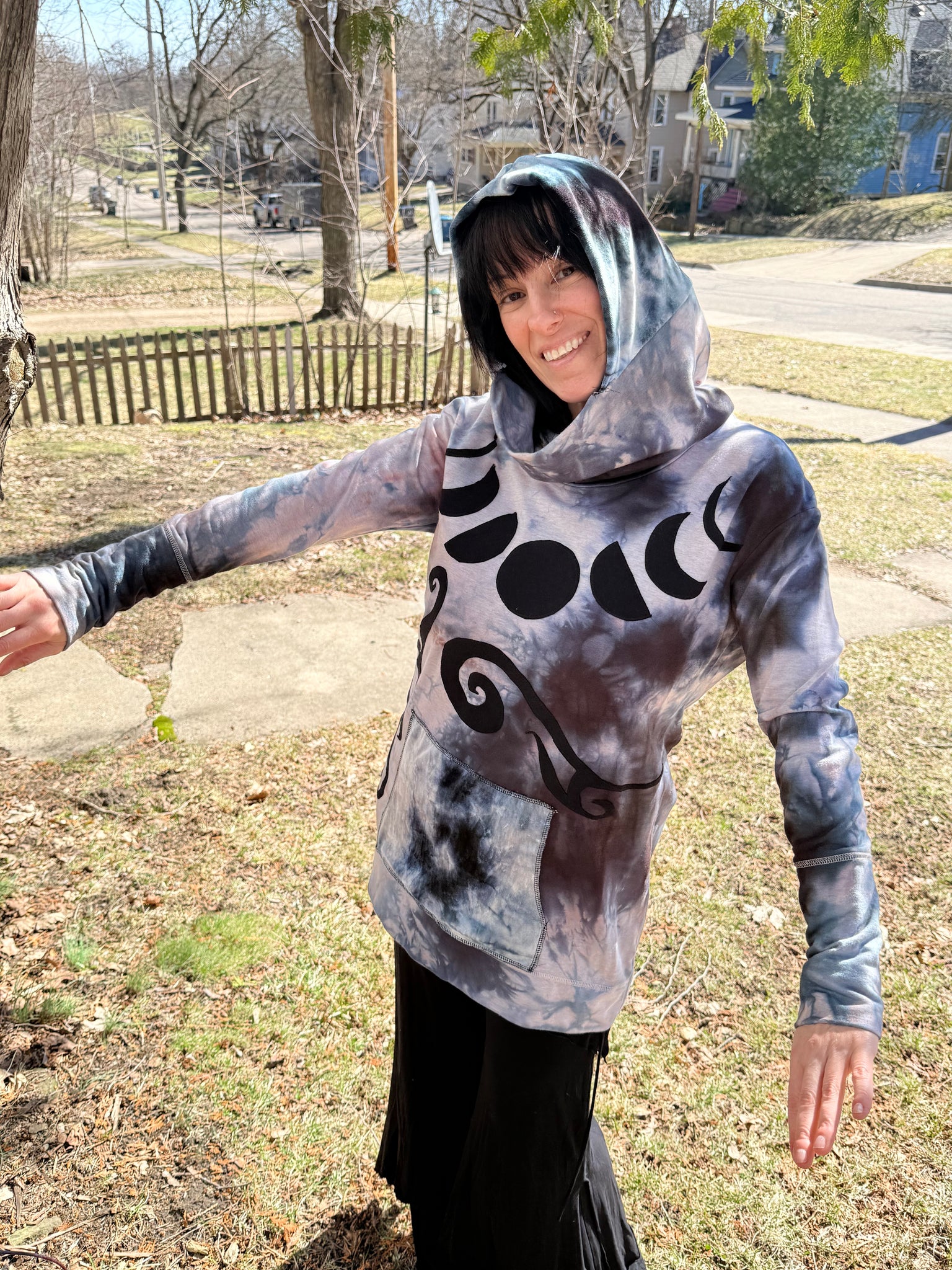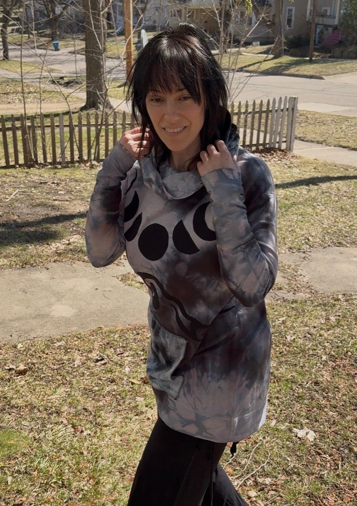 Reclaimed tunic with cowl saved from the landfill and dyed in house. I added a bamboo velour hood and pouch pocket in the front. Cotton blend with stretch moon phase and swirling appliqué sewn onto this stunner. Truly one of a kind piece is cozy and perfect for foraging and star gazing ++ many other activities