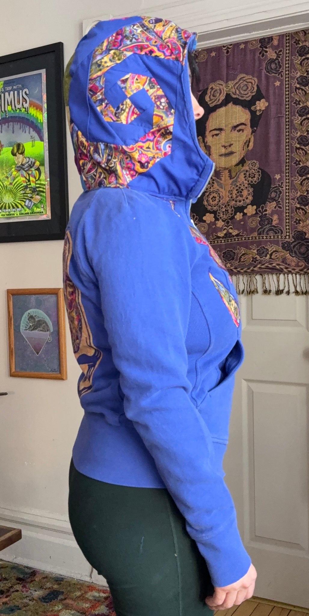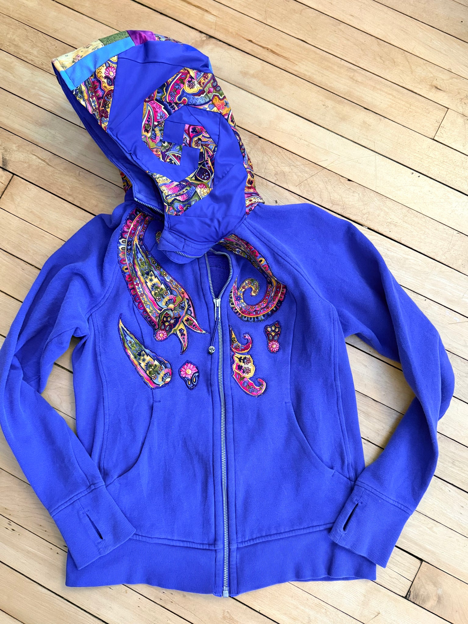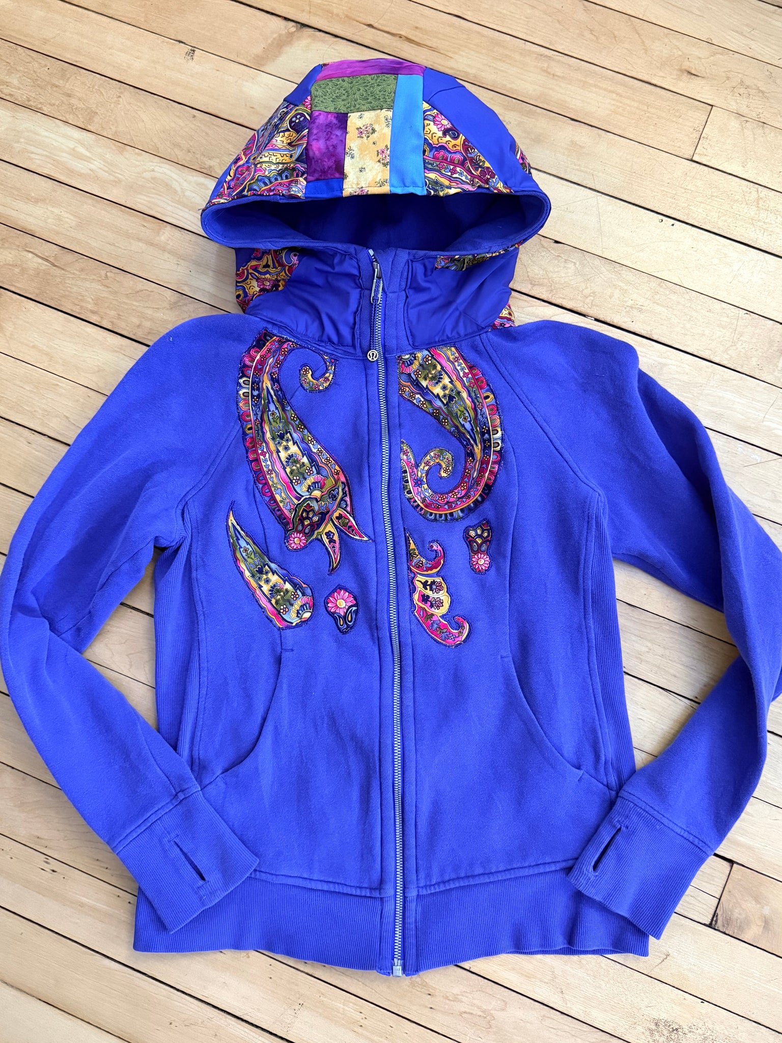 Lululemon scuba hoodie size 8 second hand sourced in great condition with lots of life left in it. I added patchwork, quilting and appliqué to make this unique one of a kind wearable art piece. Periwinkle is my favorite color and i really enjoyed making this one I almost want to keep it. Reclaimed textiles are used though out the piece in cotton that I source from estate sales, deceased quilters, thrift stores, recycle warehouses, fab scrap and other sources all saved from the landfill.