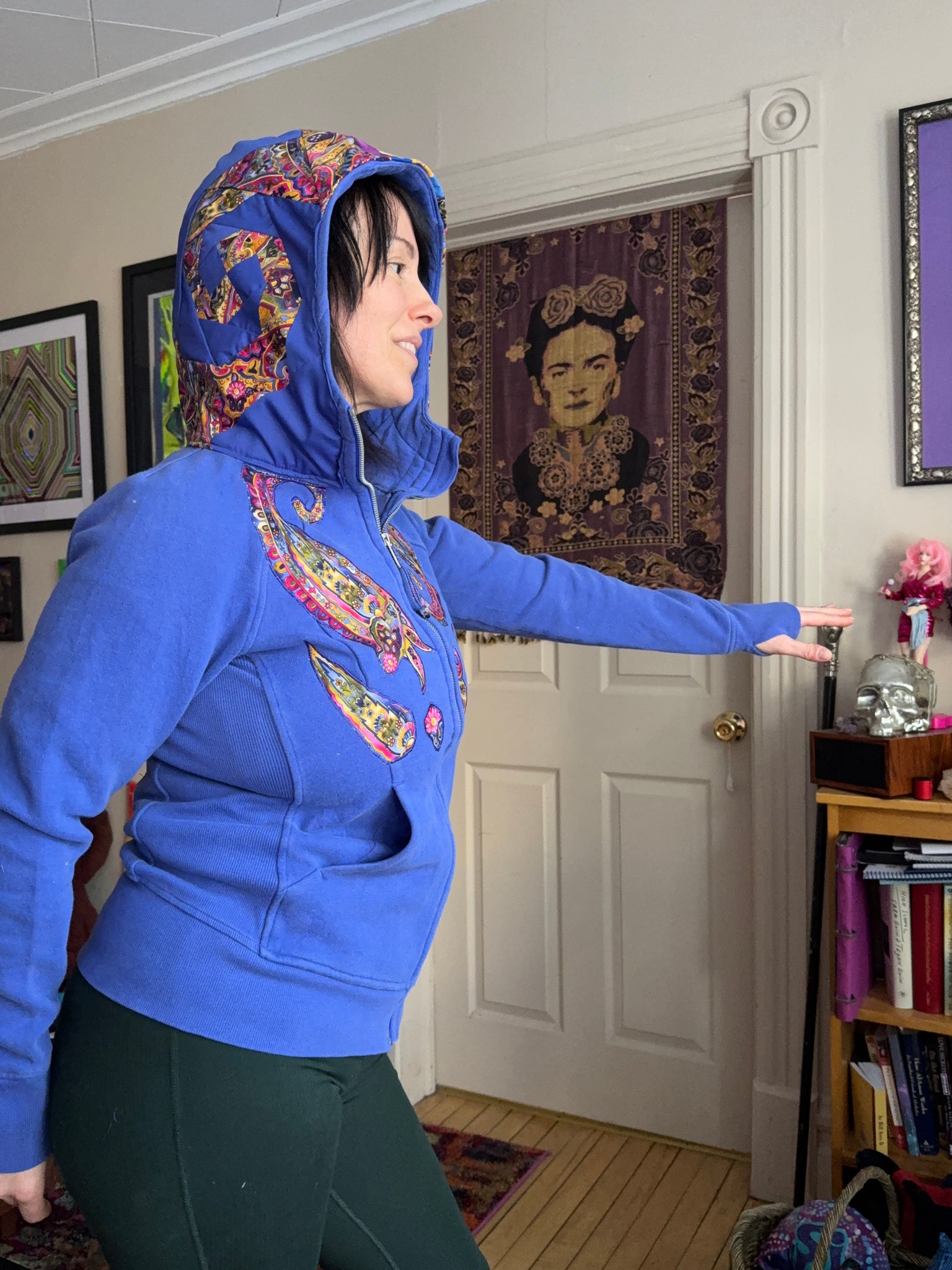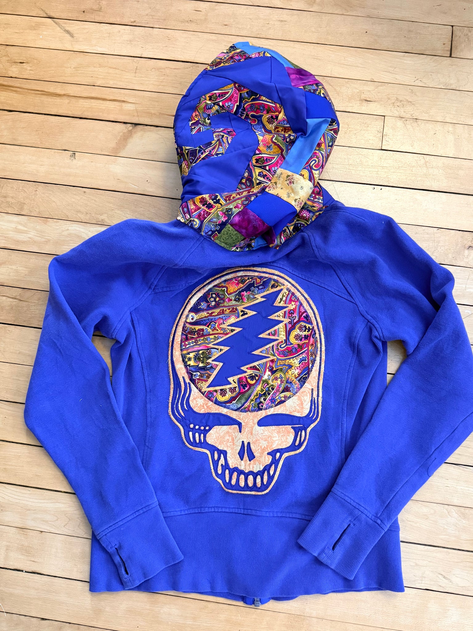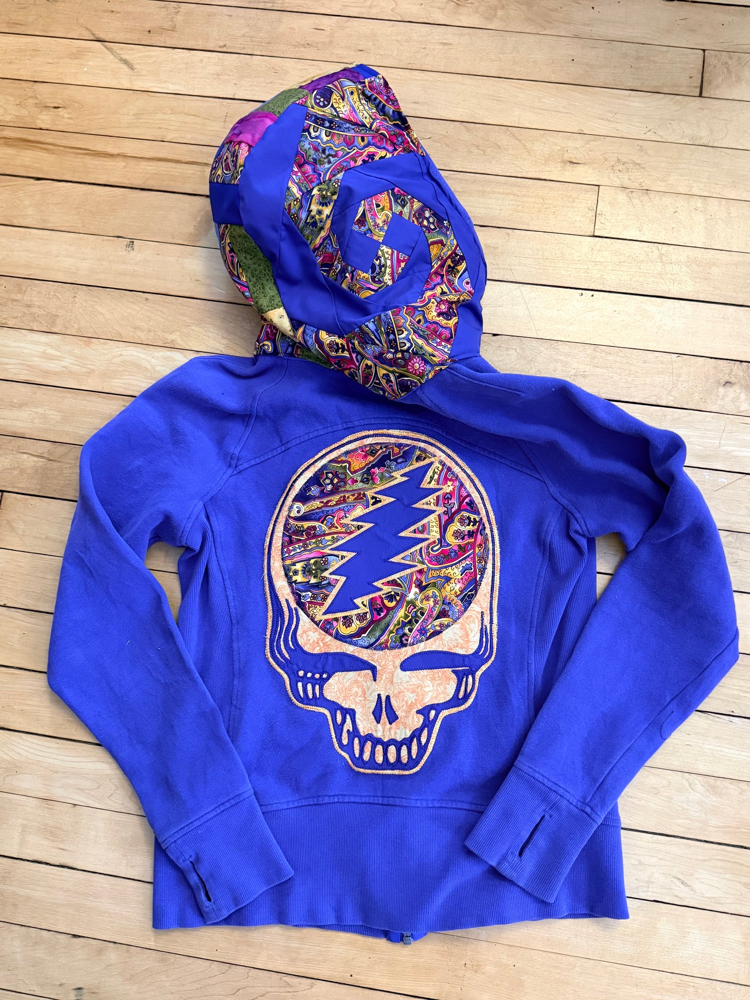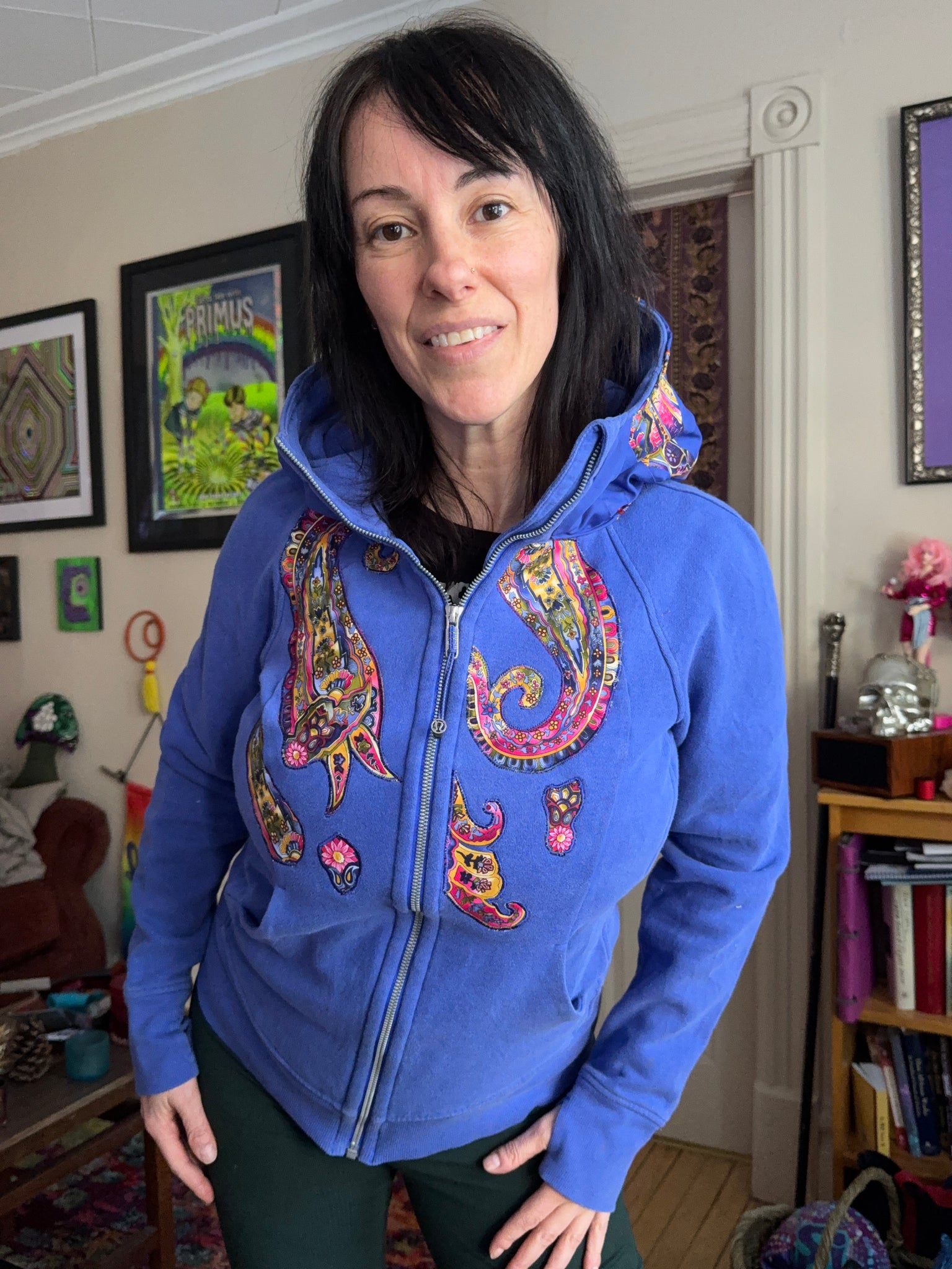 Lululemon scuba hoodie size 8 second hand sourced in great condition with lots of life left in it. I added patchwork, quilting and appliqué to make this unique one of a kind wearable art piece. Periwinkle is my favorite color and i really enjoyed making this one I almost want to keep it. Reclaimed textiles are used though out the piece in cotton that I source from estate sales, deceased quilters, thrift stores, recycle warehouses, fab scrap and other sources all saved from the landfill.