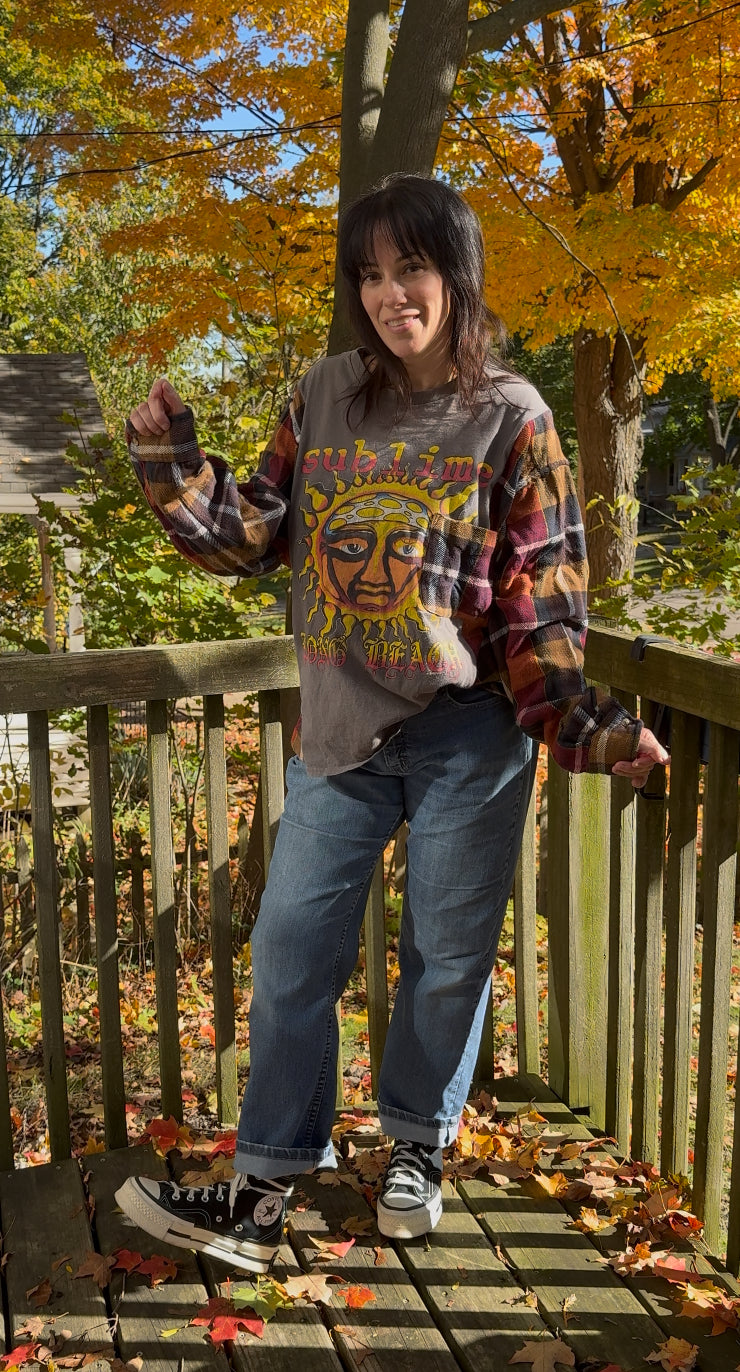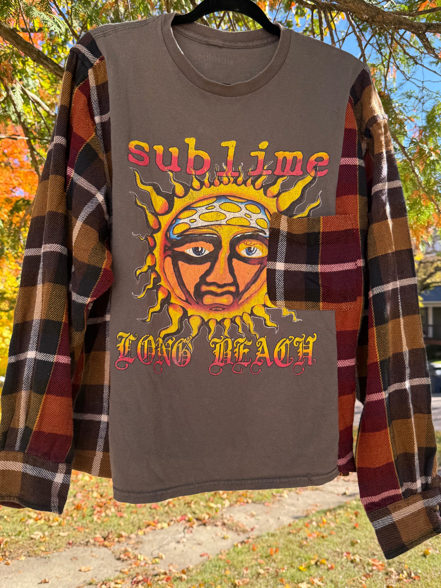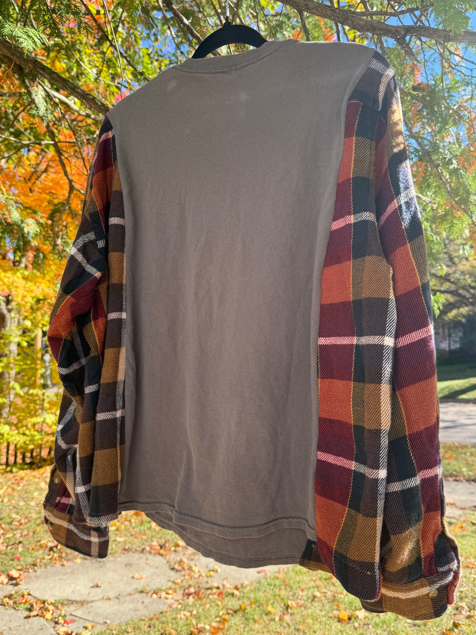 Secondhand sourced Flannel & T shirt repurposed into a long sleeve grunge style shirt with a pocket that overlays the T shirt. Made with recycled materials and sewn into a new unique piece. I’m making these for all and think they will look great on everyone!